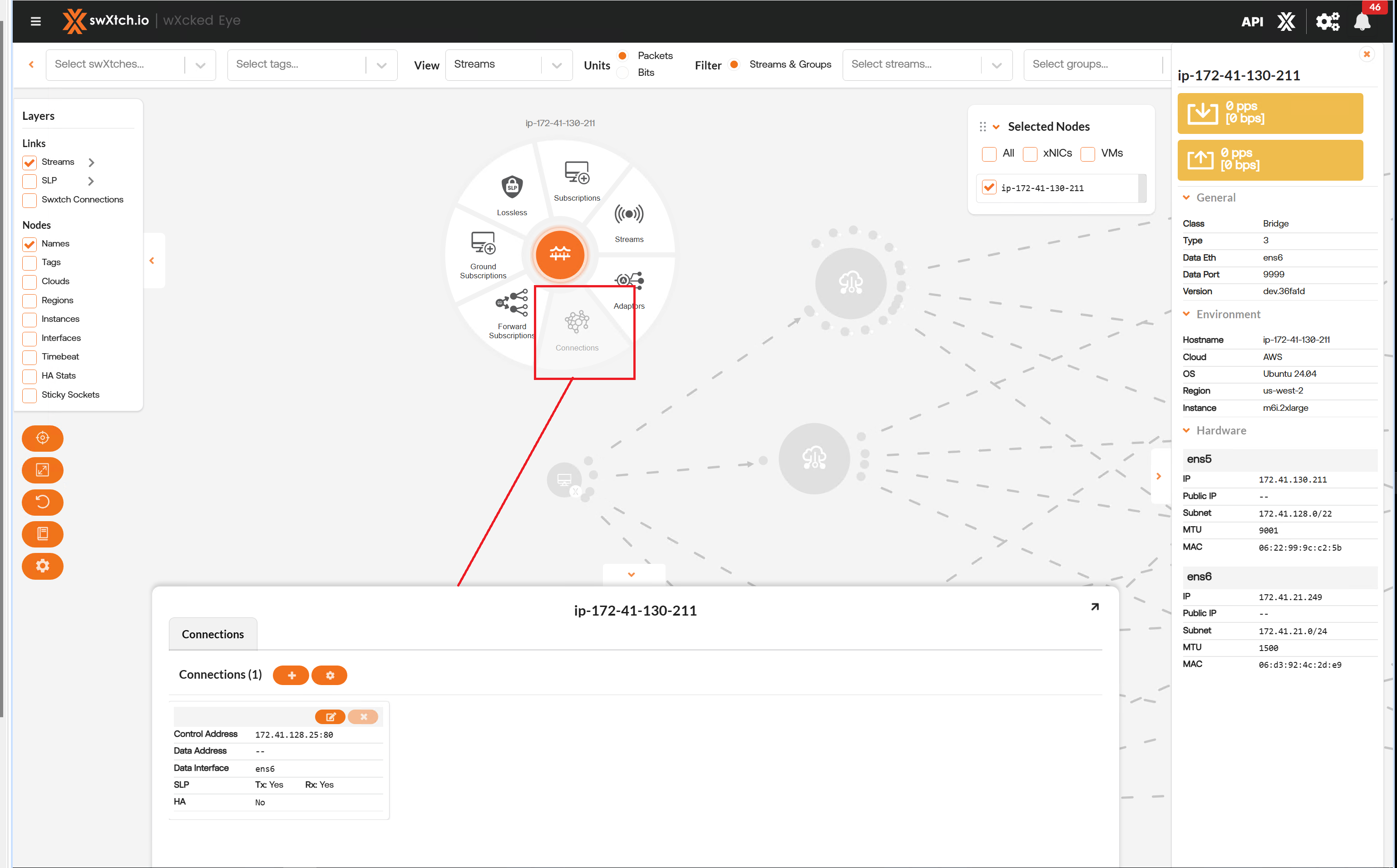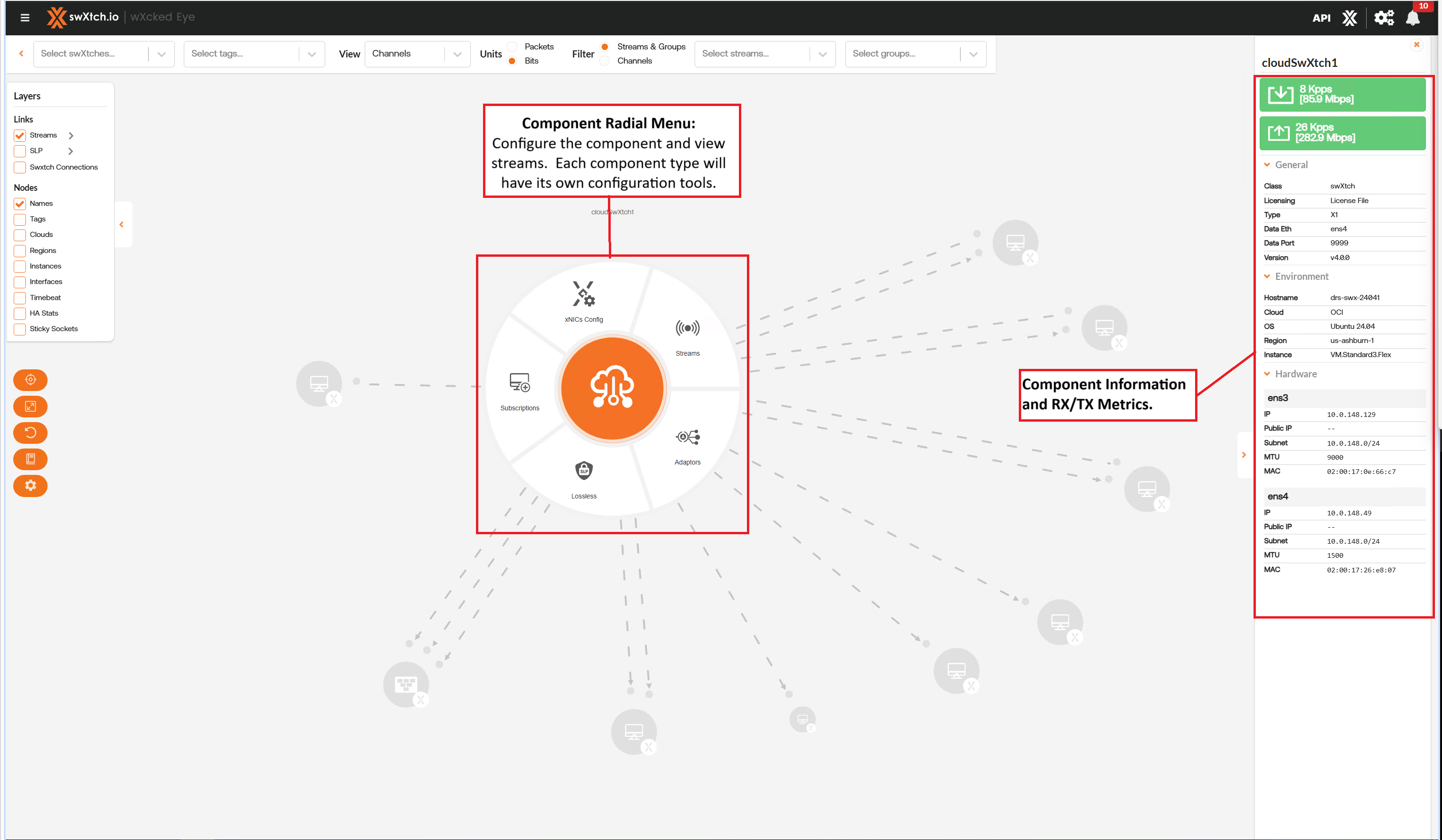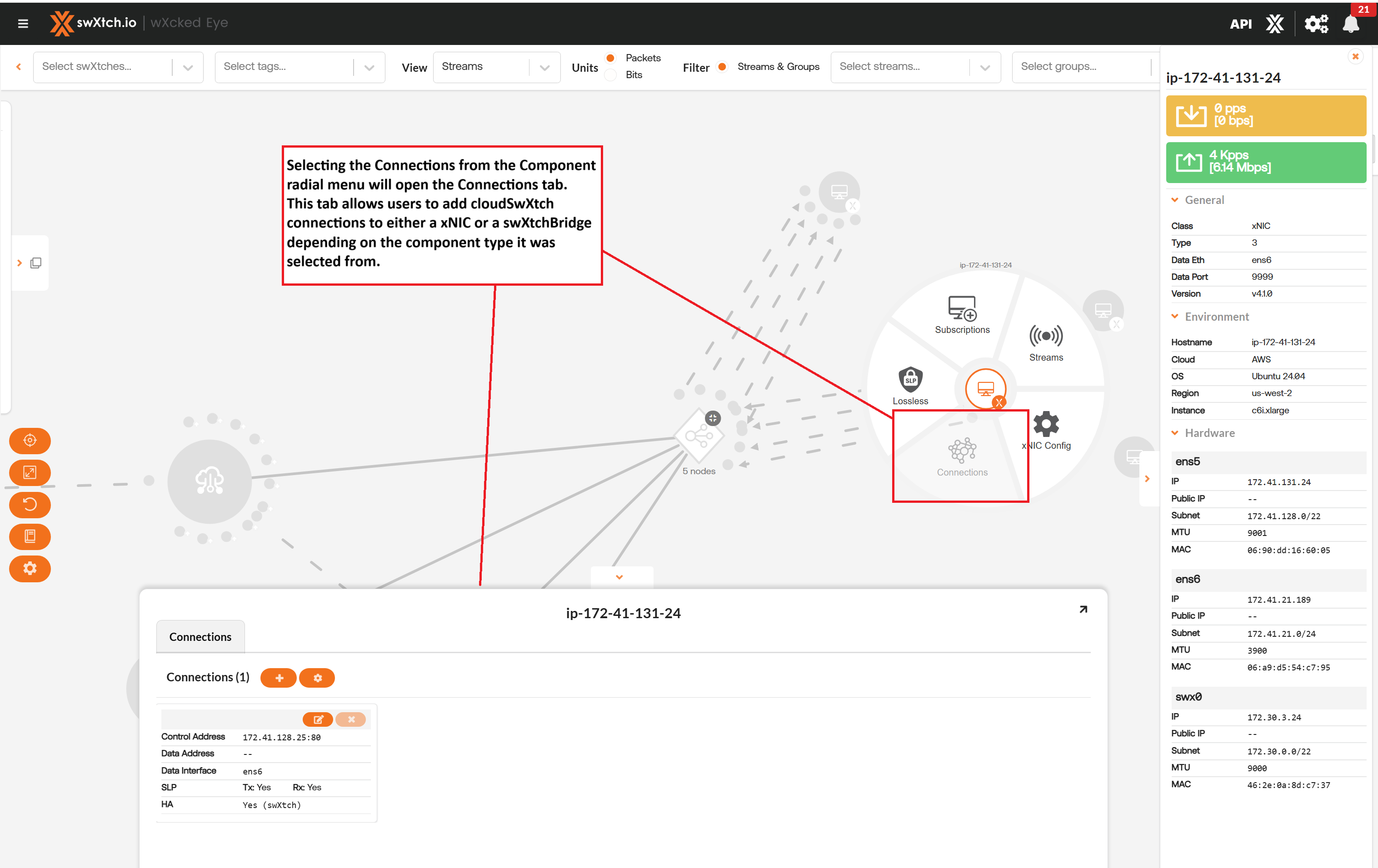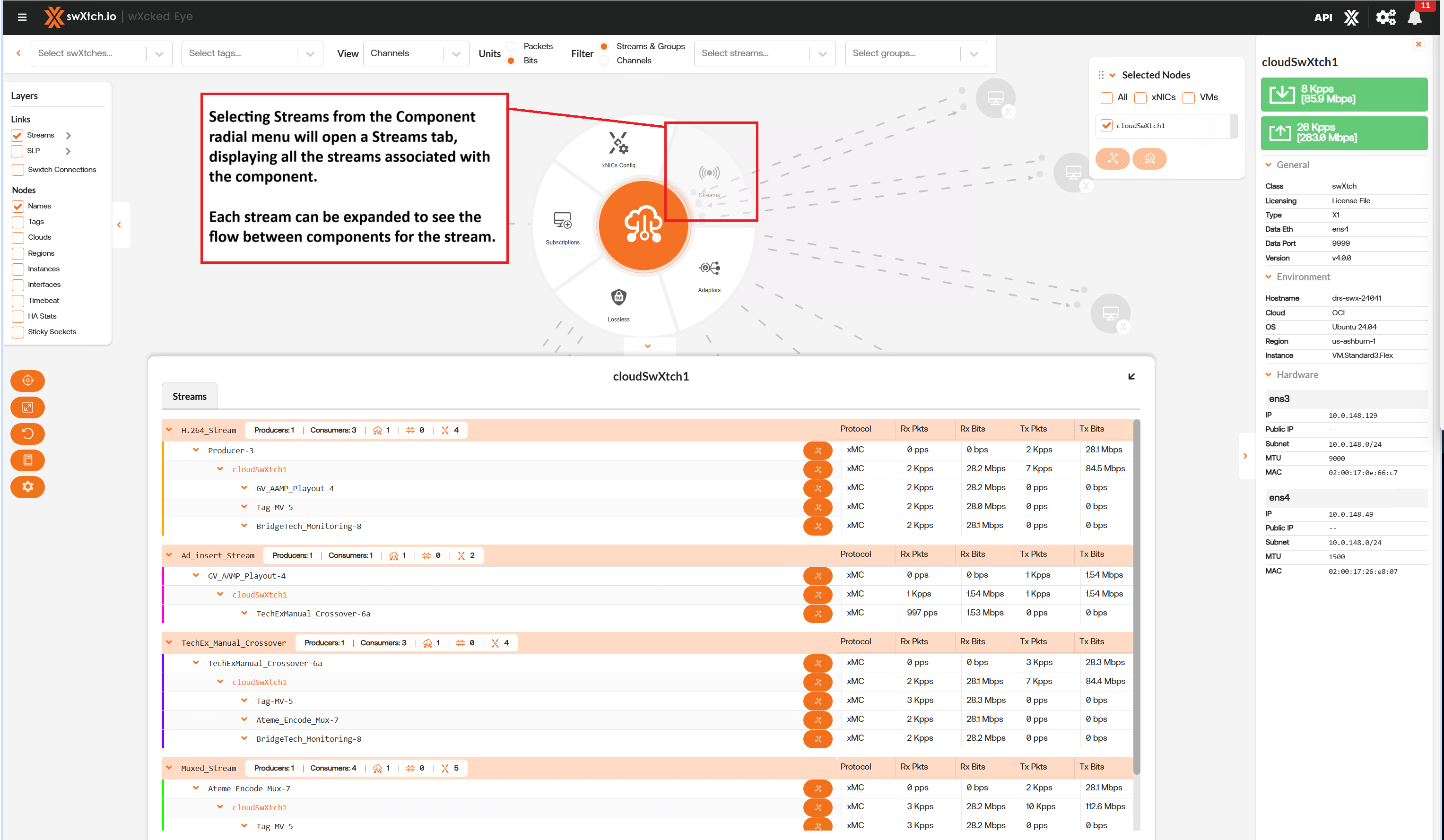 The Streams section provides users with a detailed list of all the streams going through the component and the stream data showing the flow of the stream through each component. Users can view streams for every component node (cloudSwXtch, swXtchBridge and xNIC).