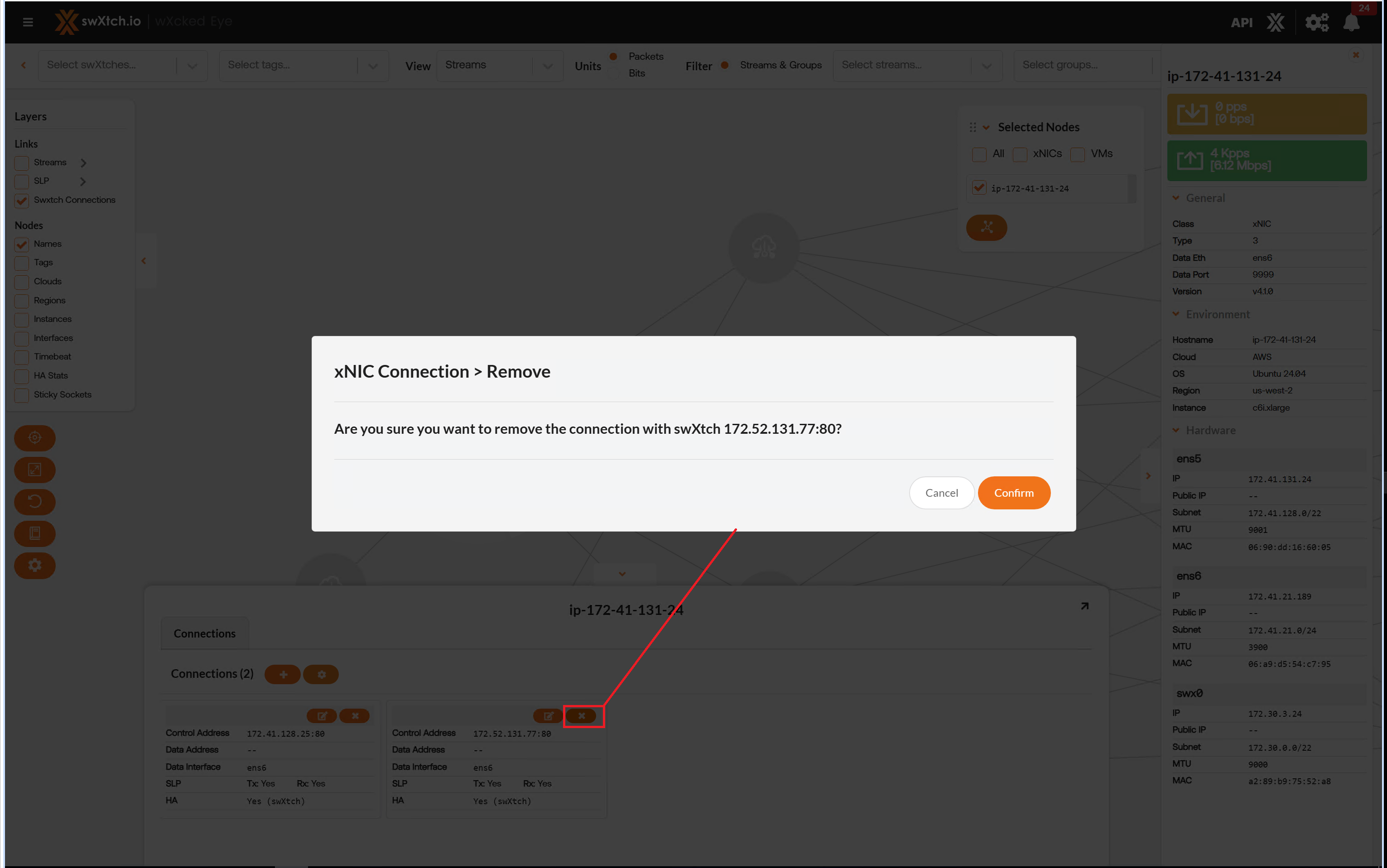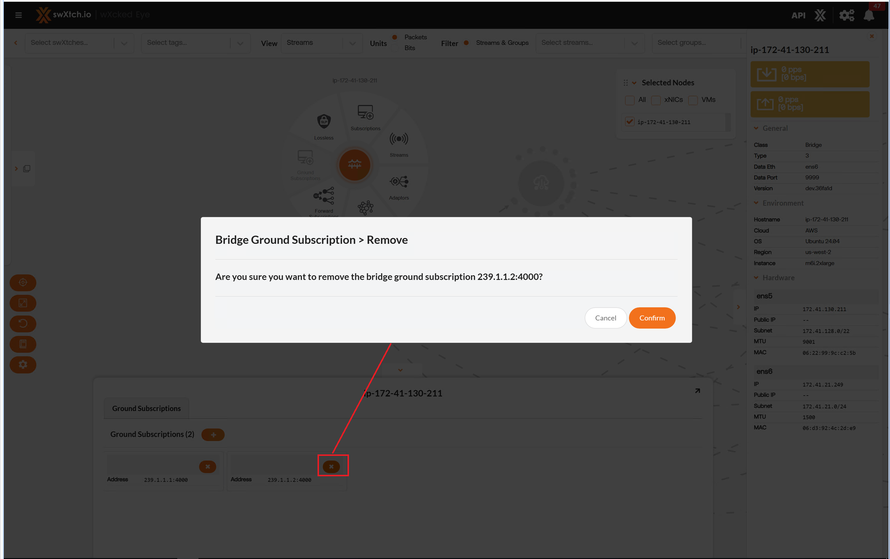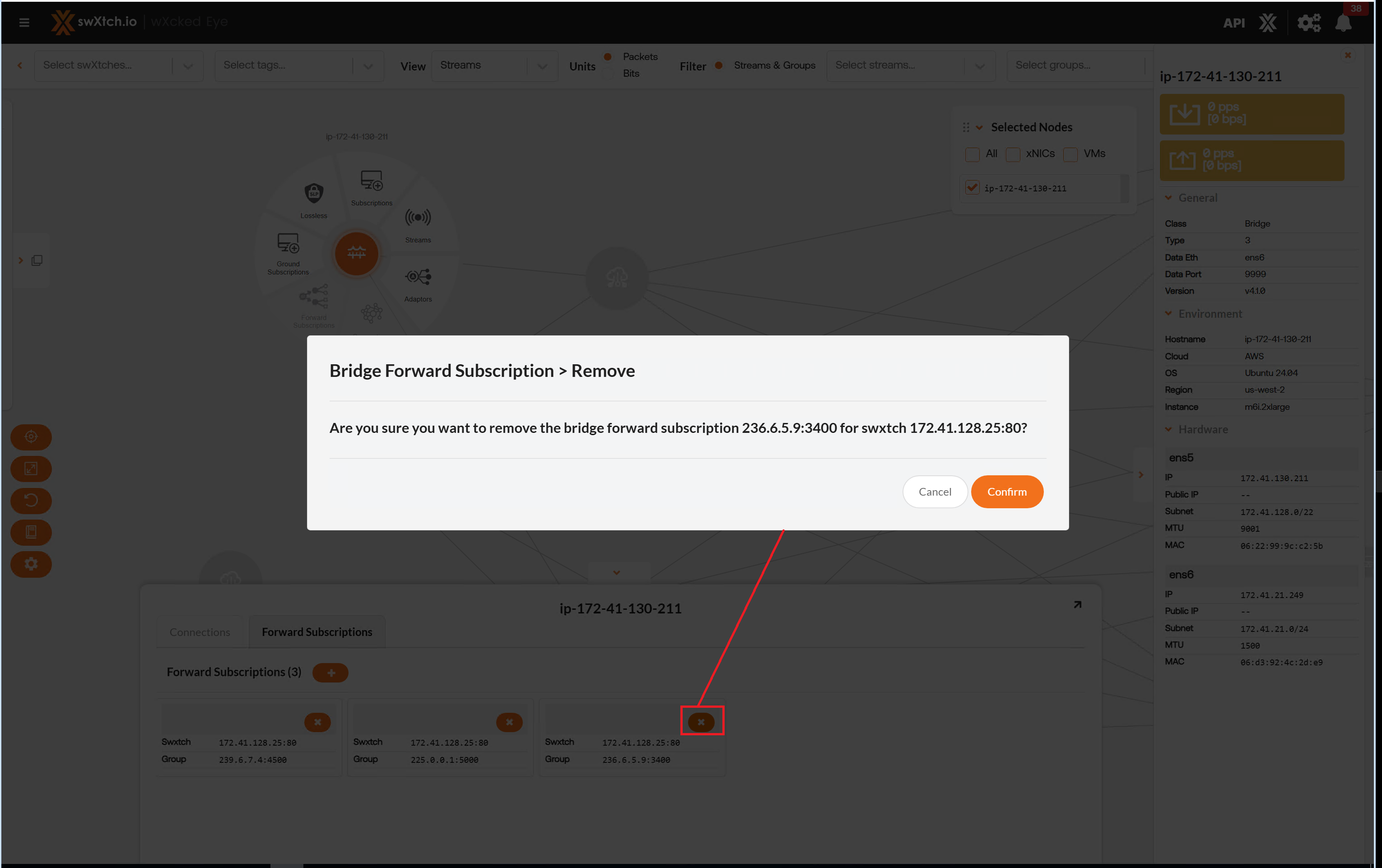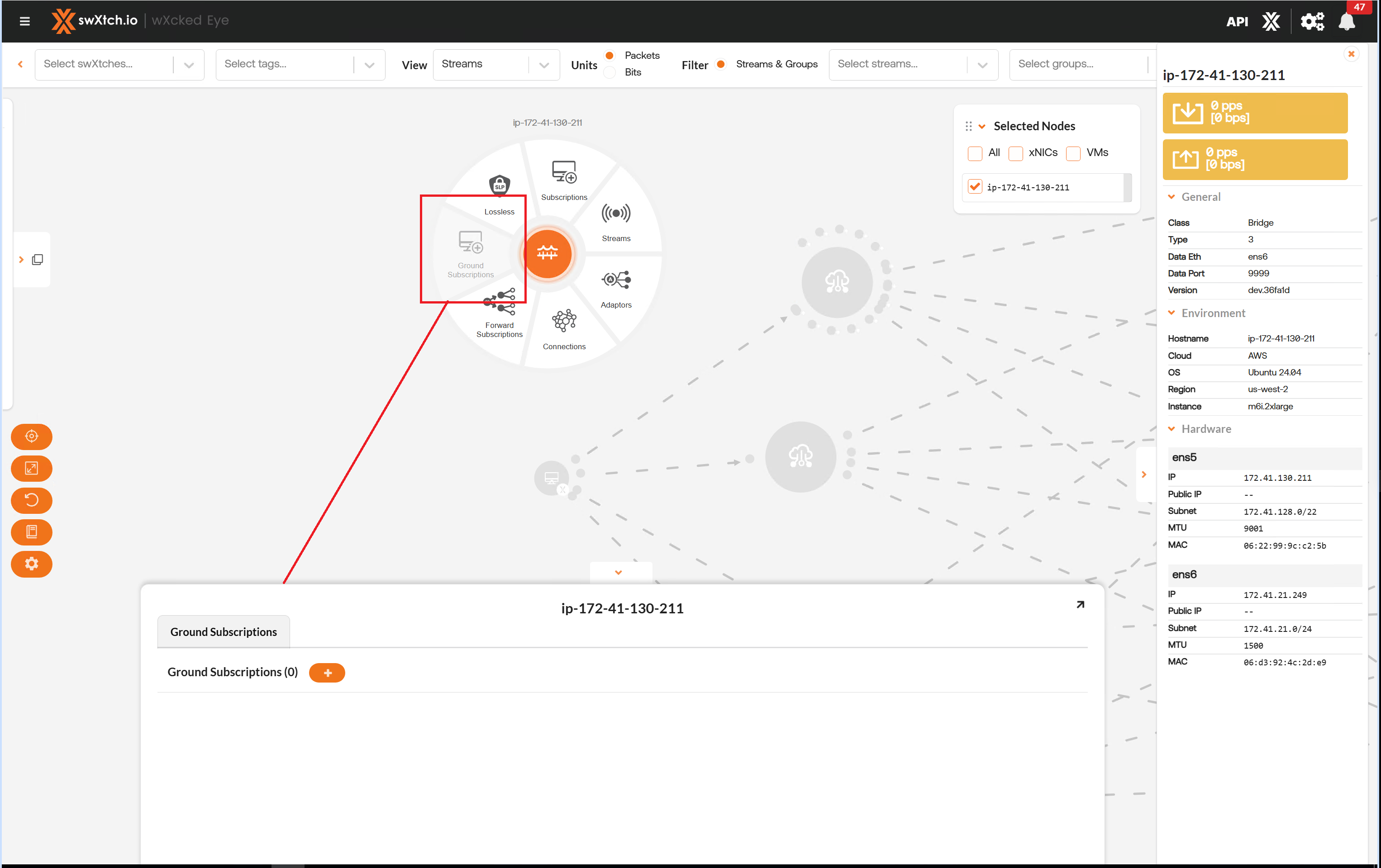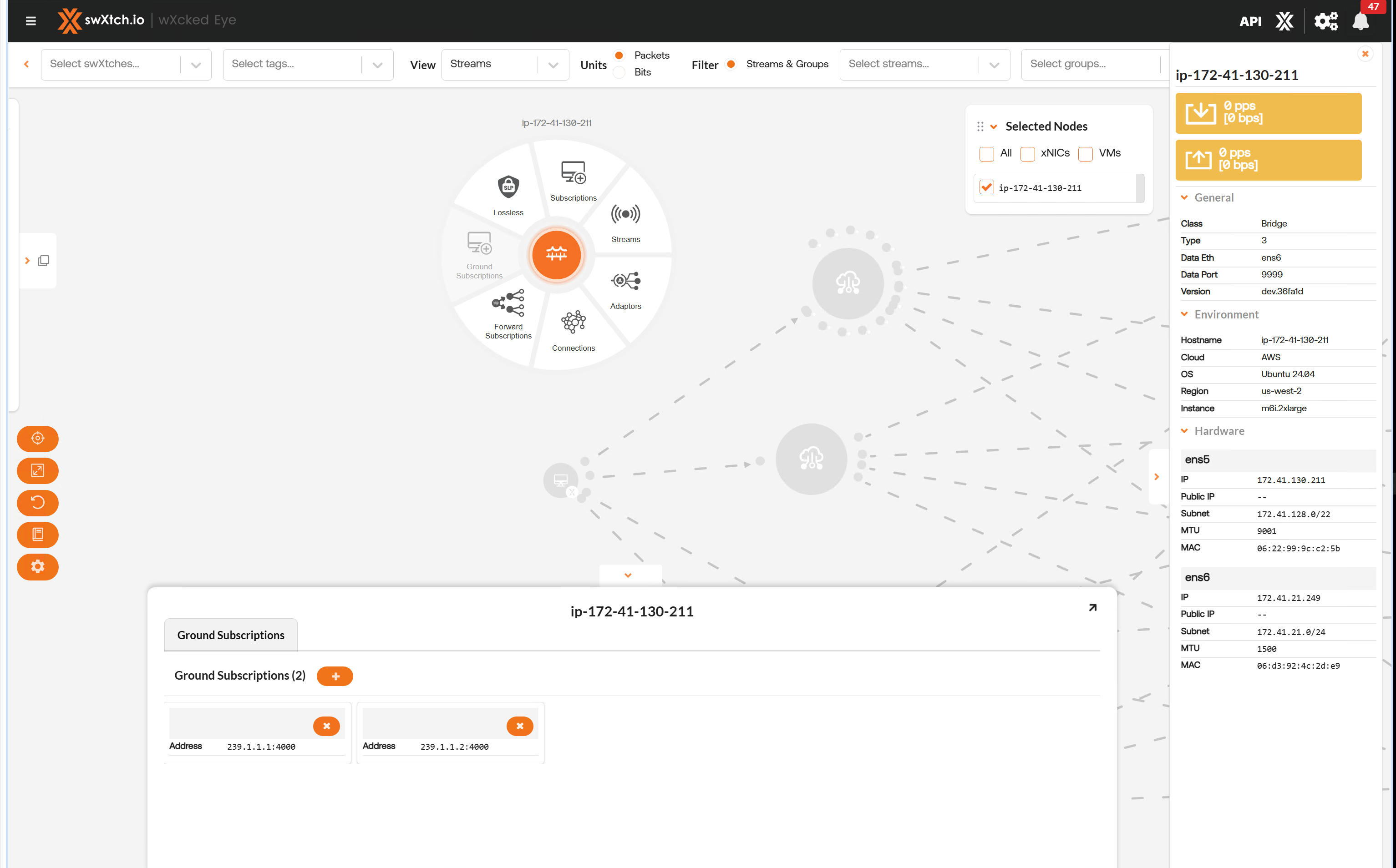 The Streams section provides users with a detailed list of all the streams going through the component and the stream data showing the flow of the stream through each component. Users can view streams for every component node (cloudSwXtch, swXtchBridge and xNIC).