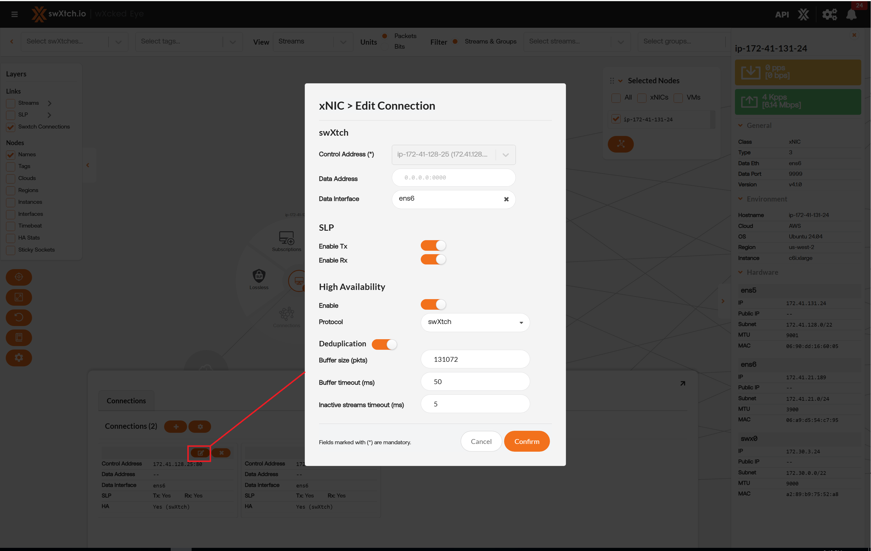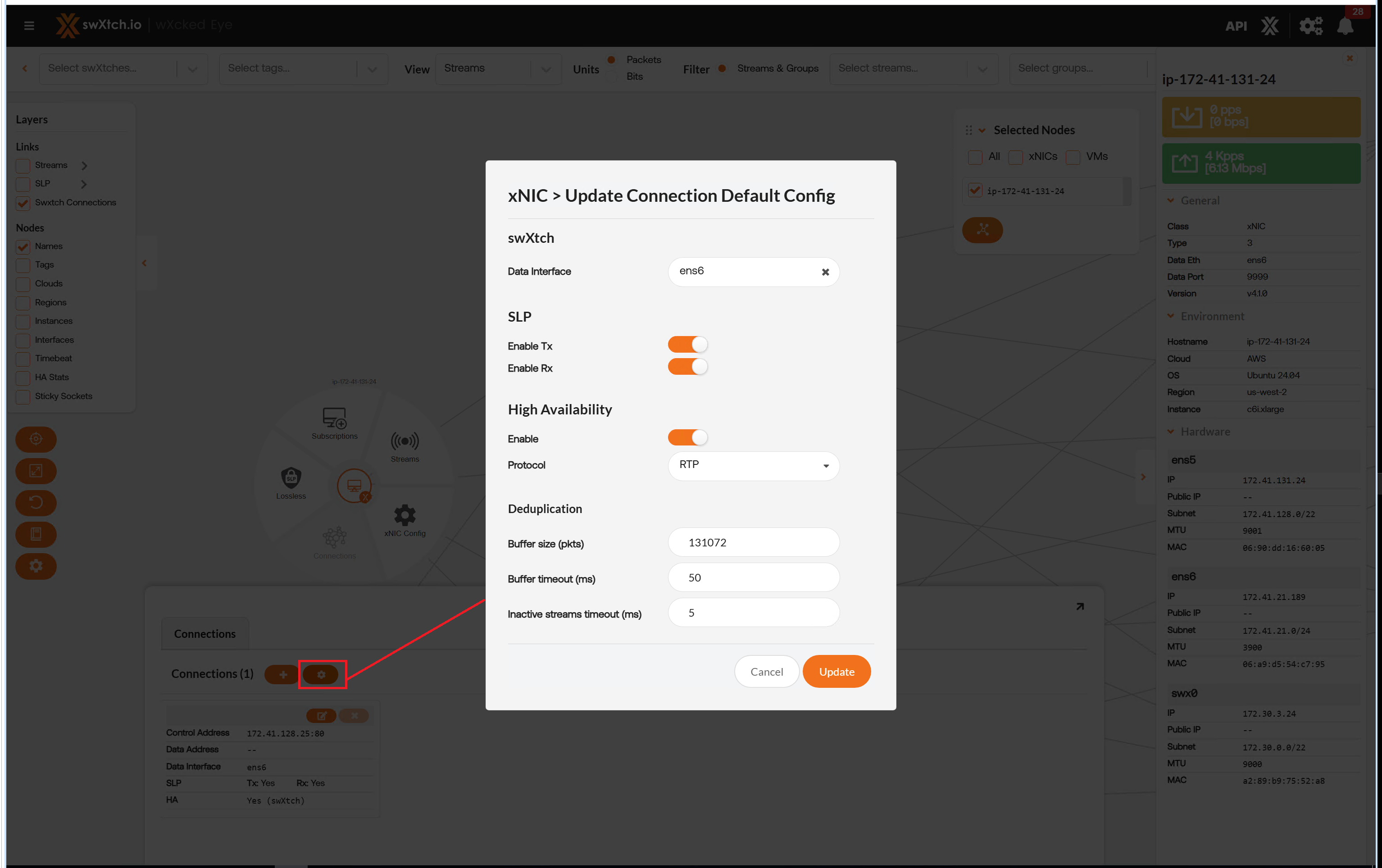 When selecting the xNIC Config, the system allows the user to edit xNICs in mass when selected from a cloudSwXtch, or individually configure interfaces for Source Specific Multicast if selected from a xNIC. For example, from a cloudSwXtch perspetive it will allow a user to enable HA and change the Protocol (RTP or swXtch). As well as enable xNIC Deduplication and set the Buffer size and timeout for deduplication purposes. xNIC config applies to cloudSwXtch and xNIC components. xNIC config on the cloudSwXtch will only display on a cloudSwXtch that is primary and if High Availability is enabled.