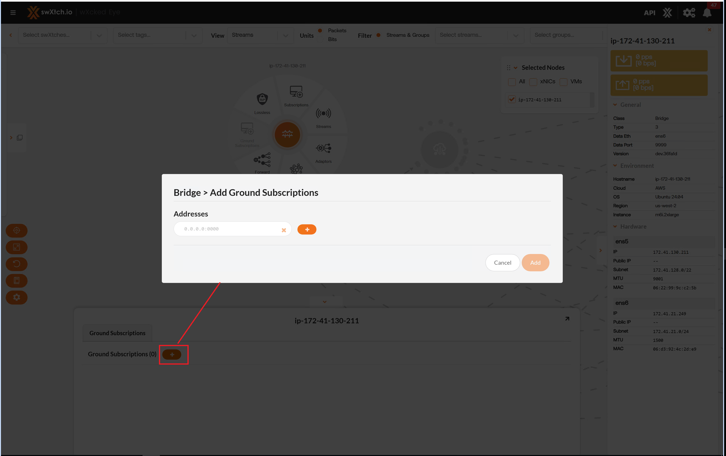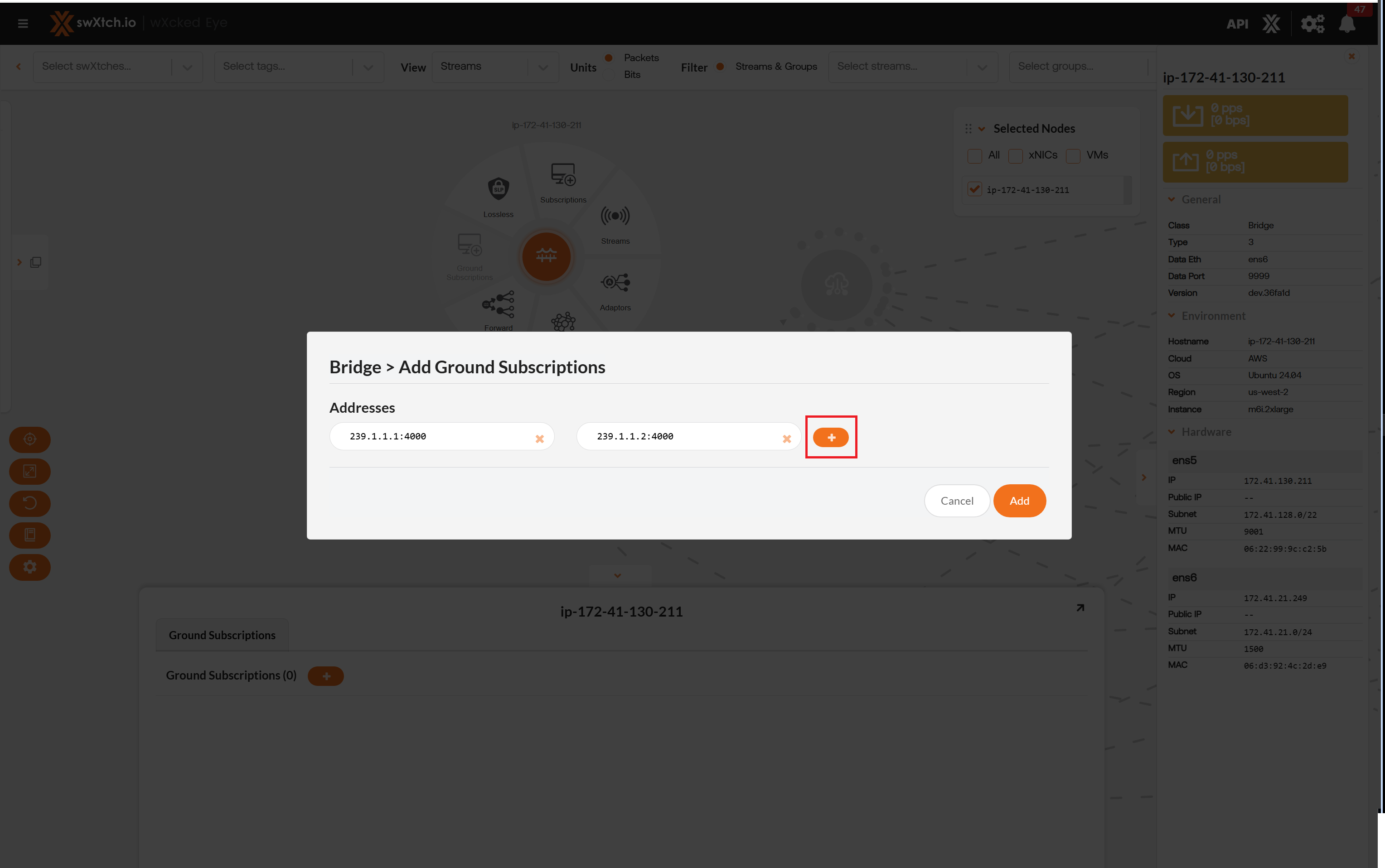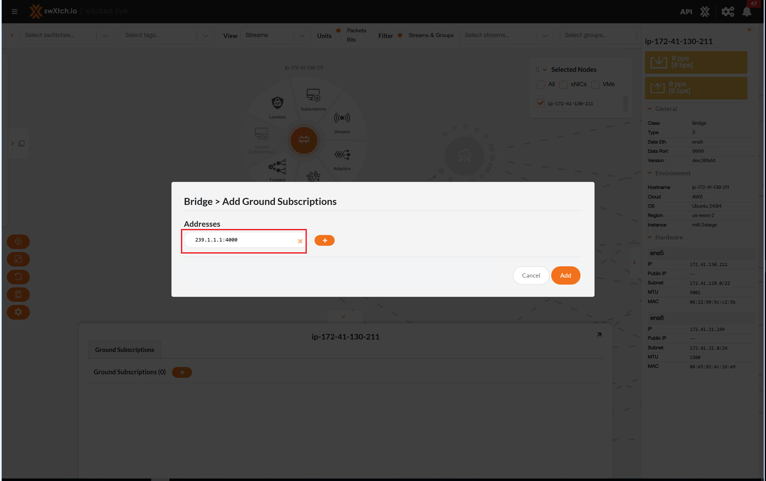 Selecting the Ground Subscriptions from the Component radial menu will open the Connections tab. This tab is only available for swXtchBridge. This selection allows a user to join to multicast groups from the cloud to the on-premise ground network. This is necessary as the on-premise switches do not inherently know about this multicast and therefore need a join point.