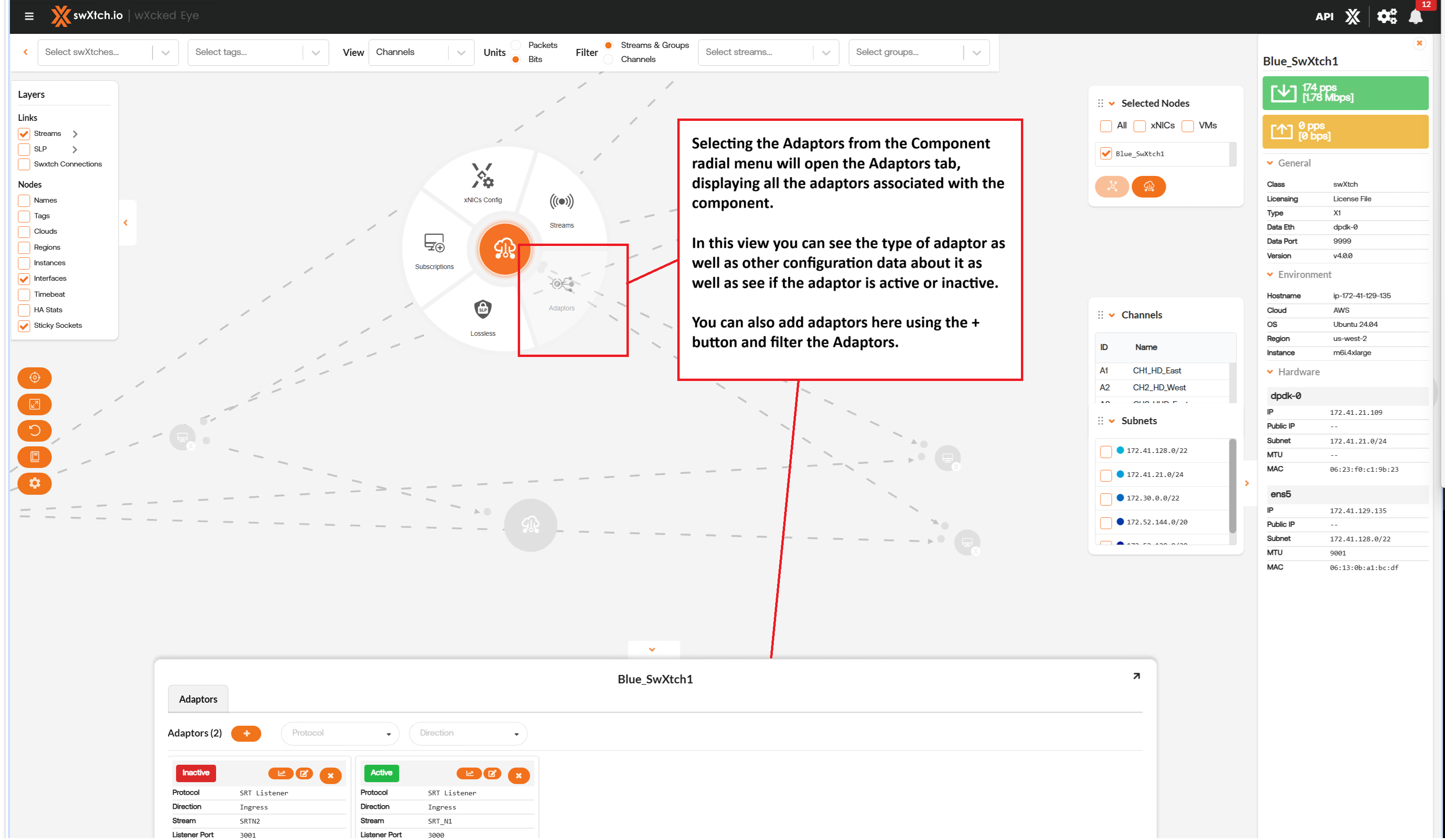 The Adaptors section will populate with information about them if any are configured in the cloudSwXtch network. Users can view Adaptors and Stream data for adaptors as well as add new Adaptors. Adaptors can also be added in the Adaptors tab. Adaptors apply to cloudSwXtch and swXtchBridge components.