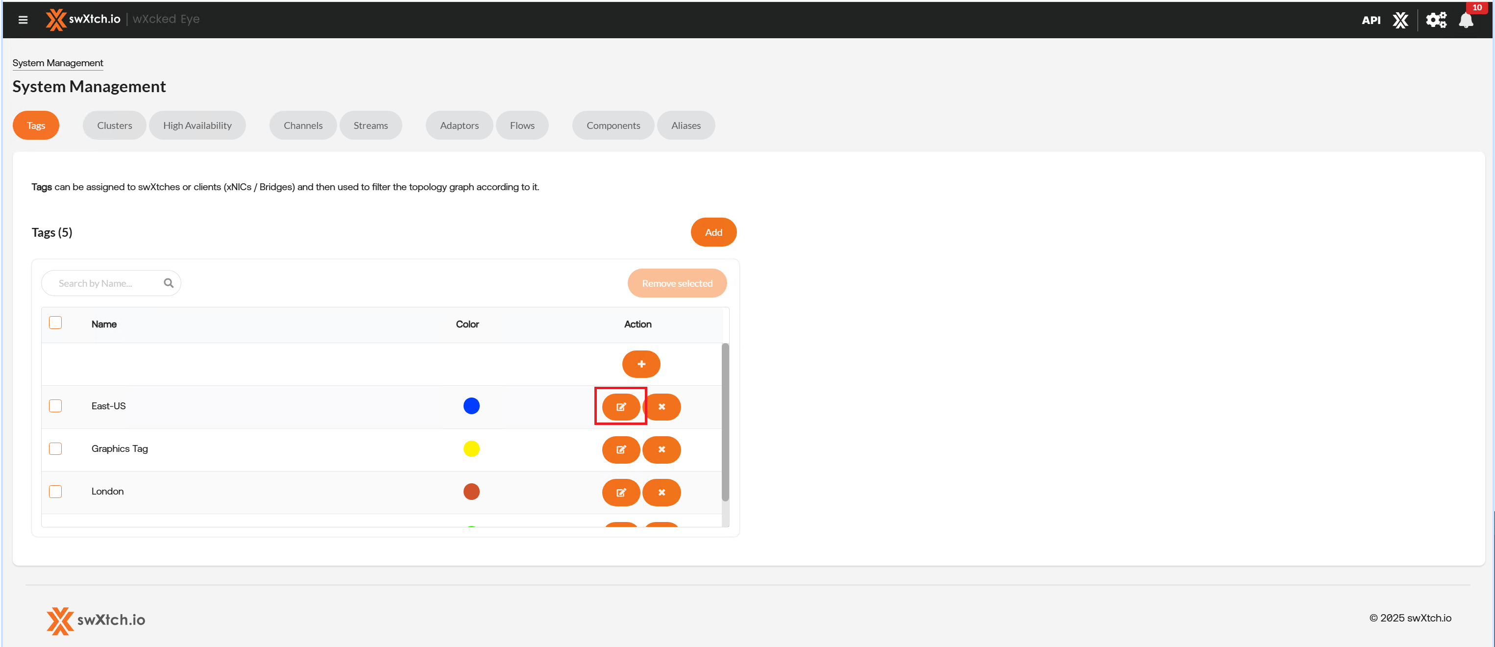 The Tags tab allows users to create tags to easily filter cloudSwXtches, Clusters, and xNICs within views such as Topology Graph. The graph will show any element that is configured in the system. By adding tags, the user can then filter to only components with that tag.