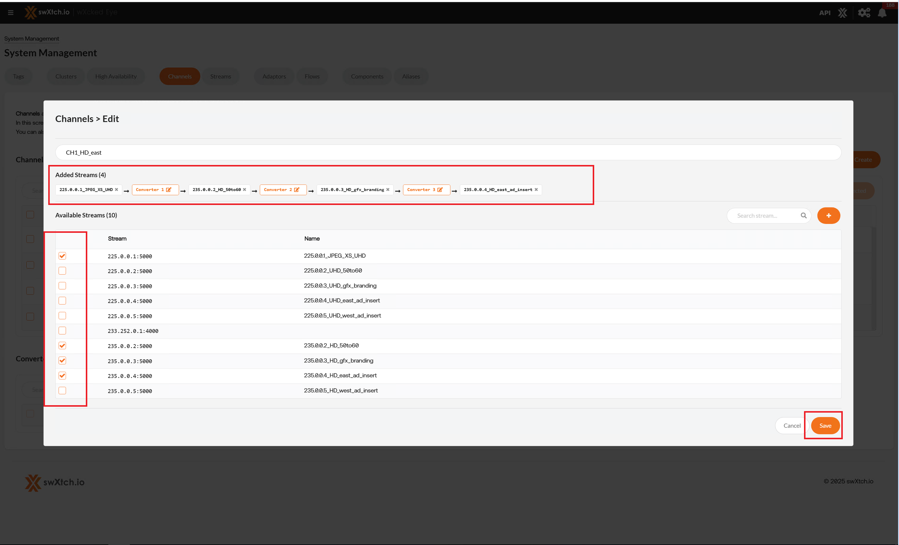Select the streams to be added to the Channel configuration from the Available streams list based on the order of your processing. As you select, they will be added with a converter between the selections.