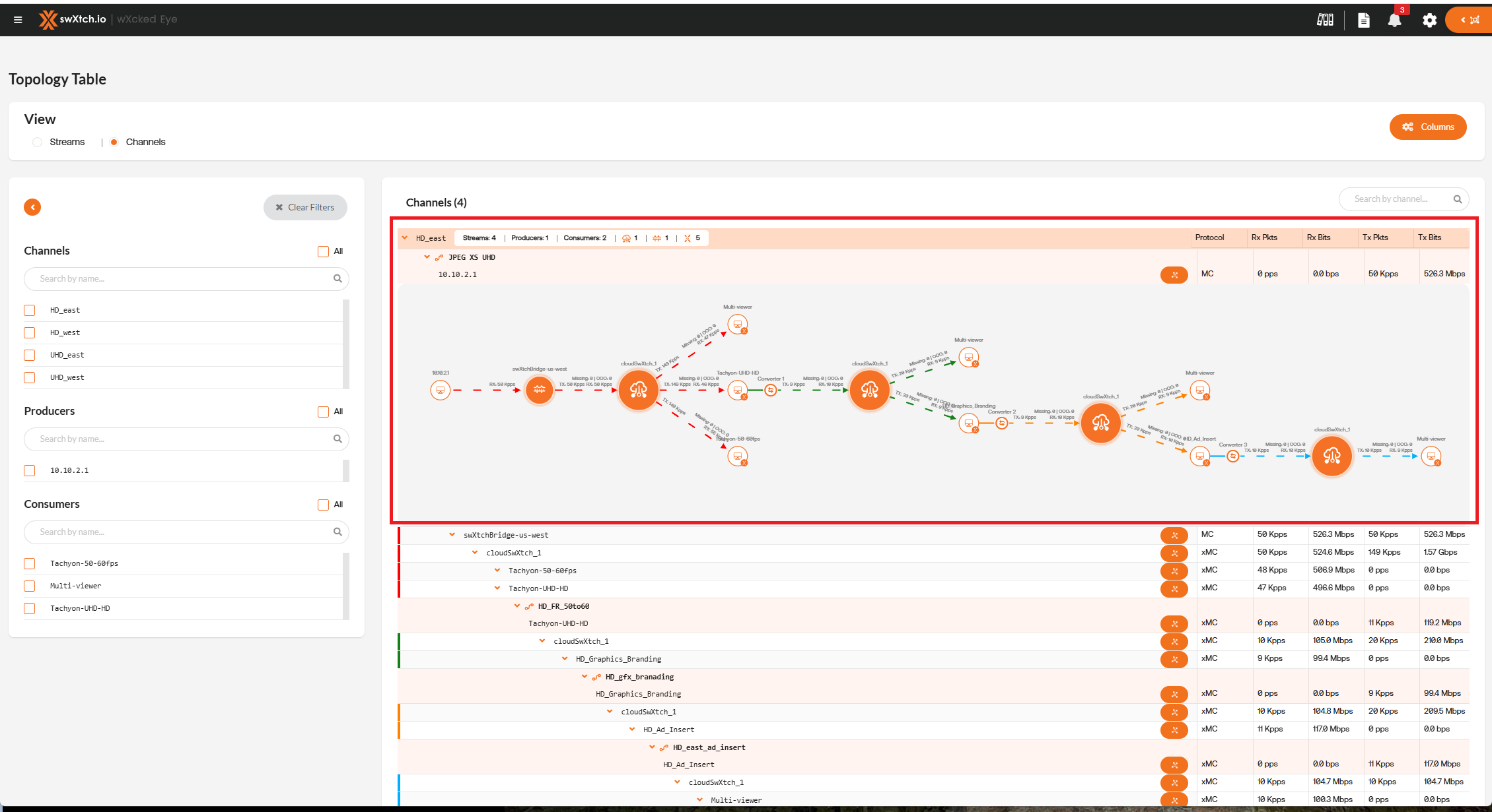 wXcked Eye Topology Table/Channels to see the channel in a table format showing from ingest to playout all of the streams as they progress through the various cloudSwXtch components.