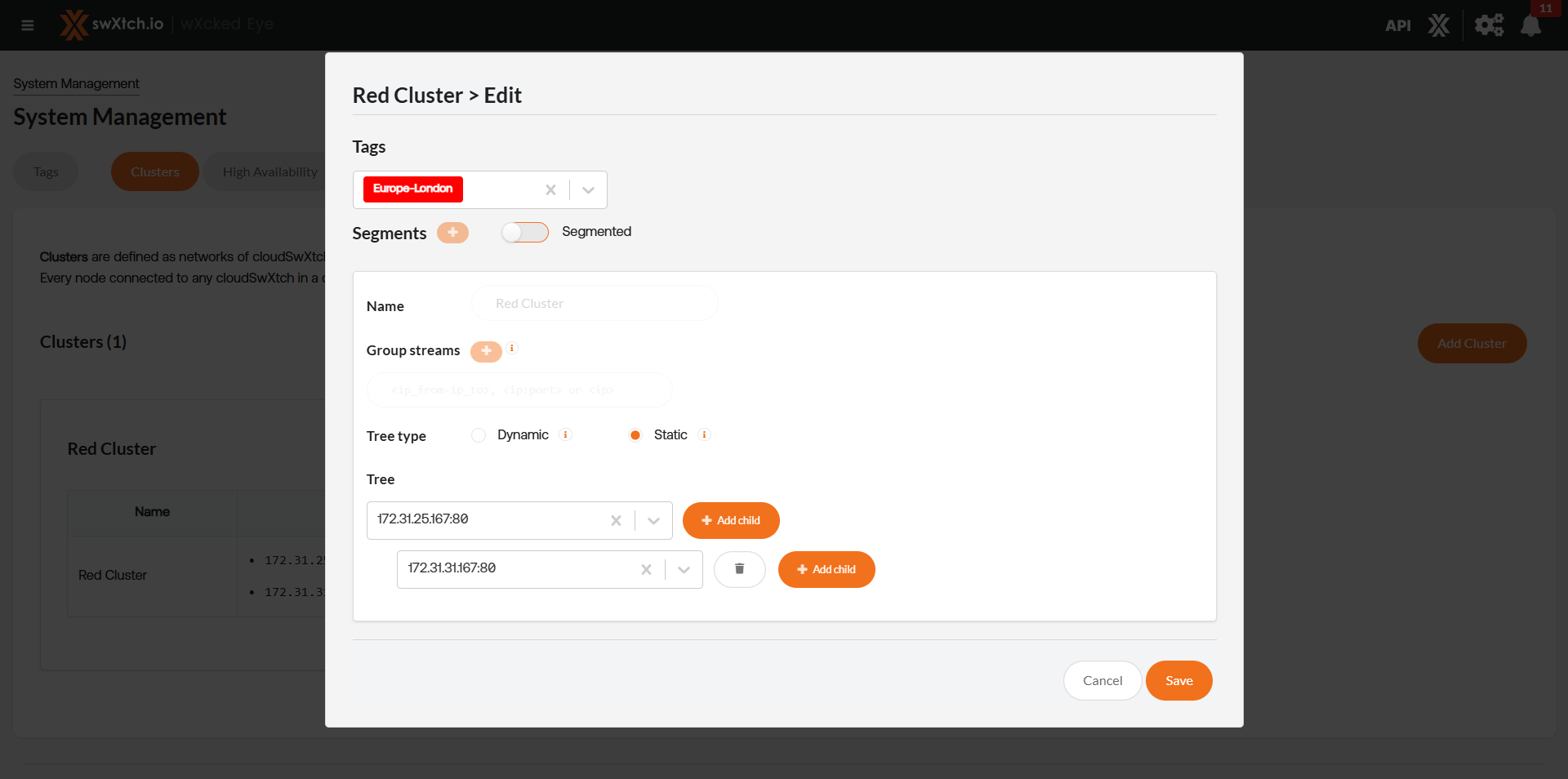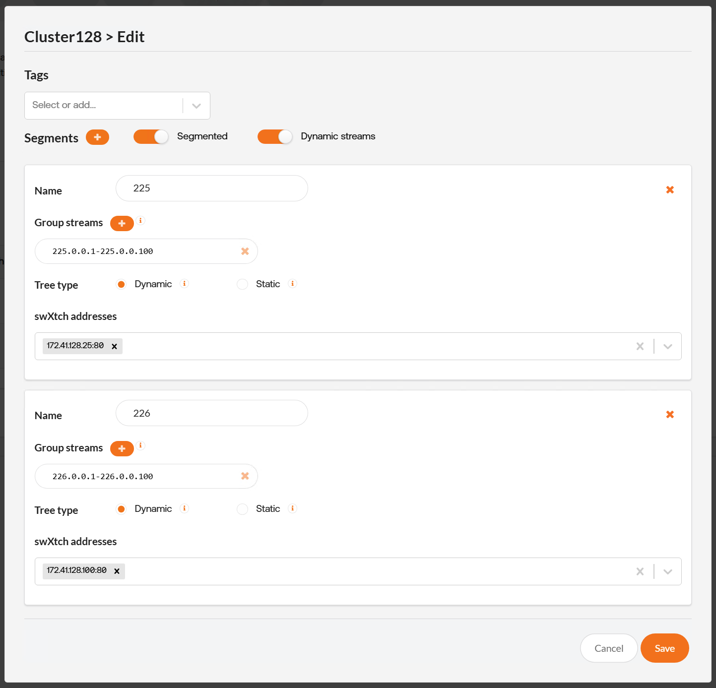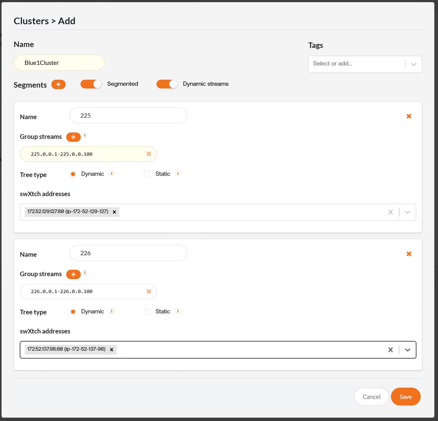 Segments allow dividing the multicast traffic into segments, sending some streams through specific clusters/cloudSwXtches. Several segments can be created by clicking on Group streams and configuring the values (either with dynamic streams that will distribute them automatically, doing load balancing, or manually). Segments are explained in Configuration Examples for Cluster Segments