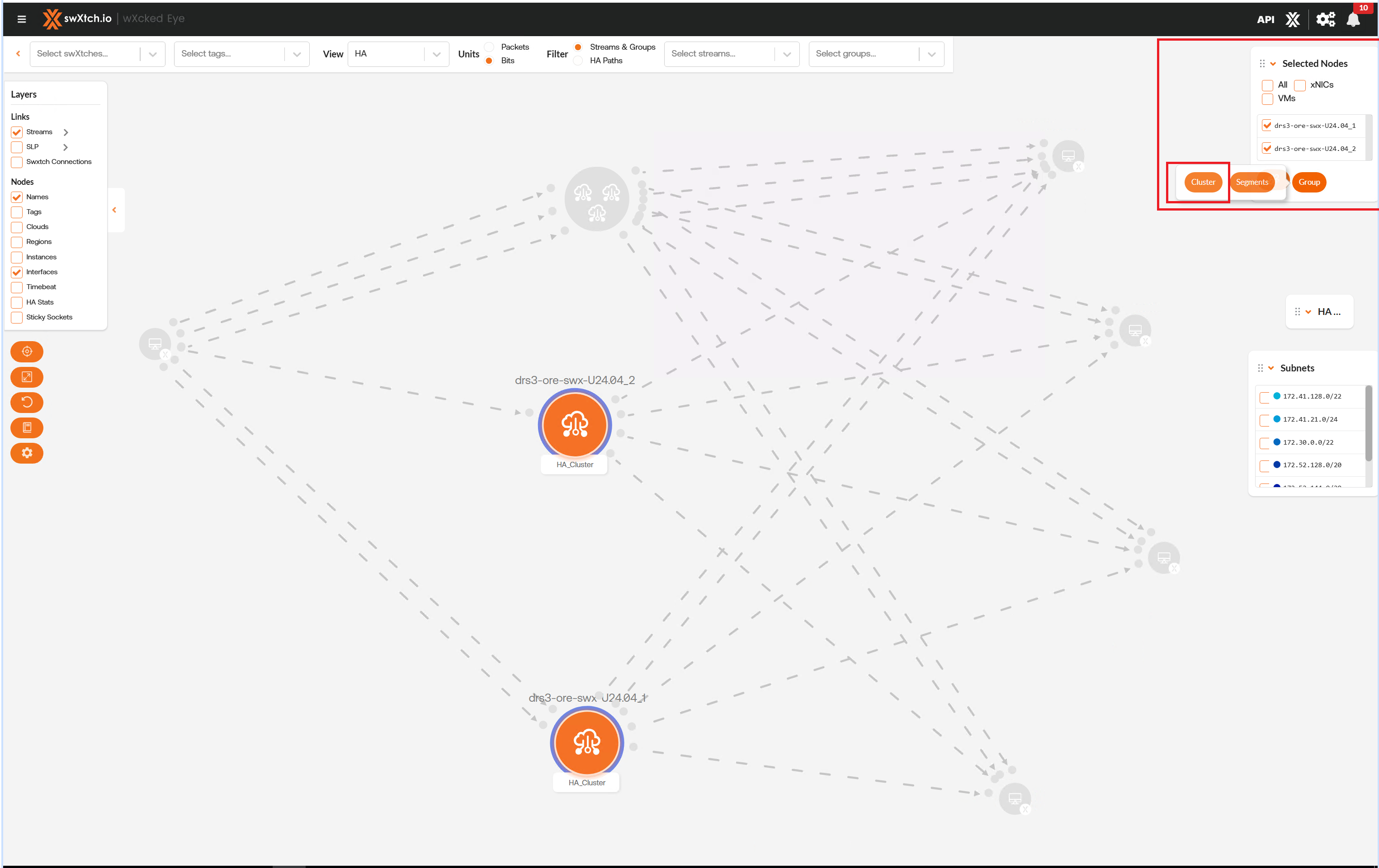 Since the cloudSwXtch(s) are acting as one for enabling higher throughput and scalability, they can also be viewed as one by grouping them using the selected Nodes. You can select the Node and then select the group and cluster to combine them.
