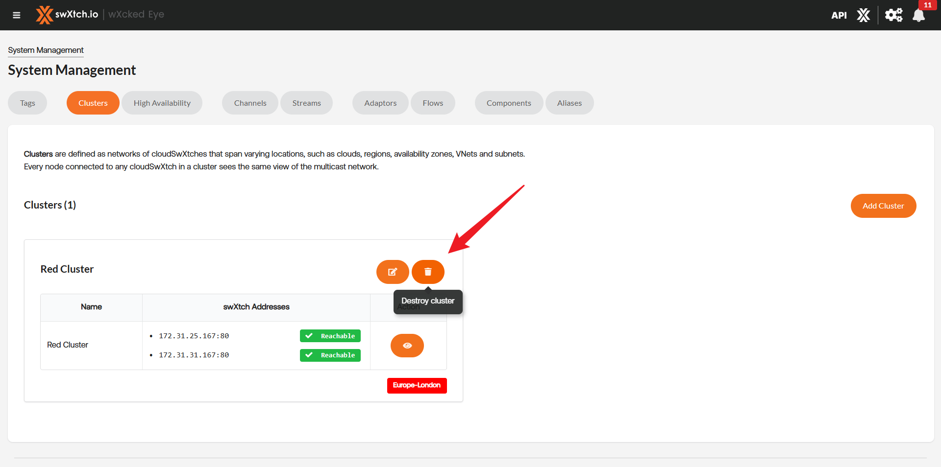The Clusters tab is located in the System Management page on wXcked Eye. To learn how to navigate there, users should review the wXcked Eye System Management article.