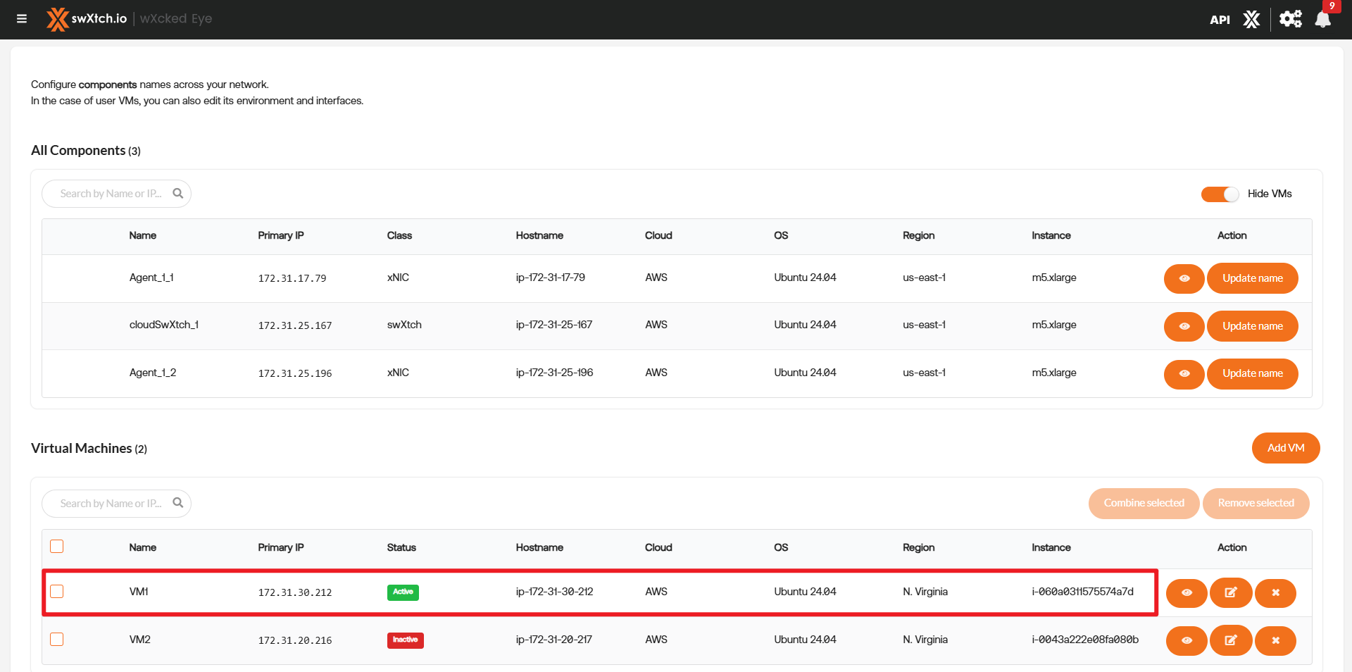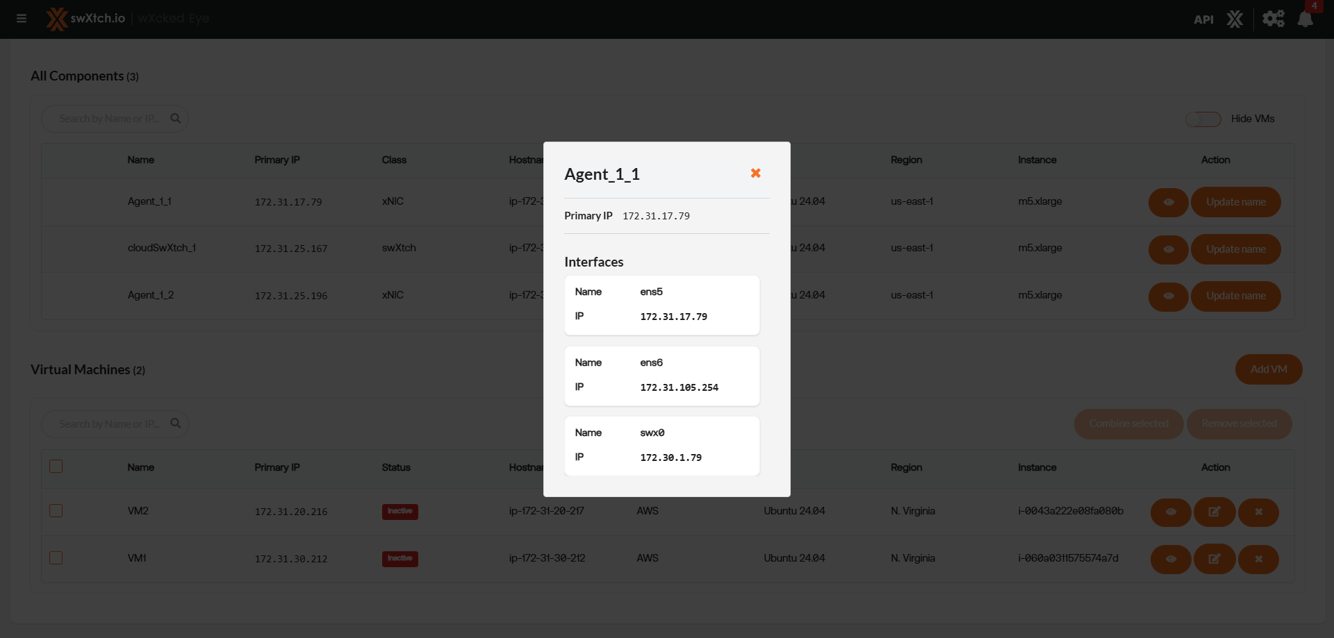 Like the Components, users can look at the VMs’ interfaces by clicking on the eye icon.