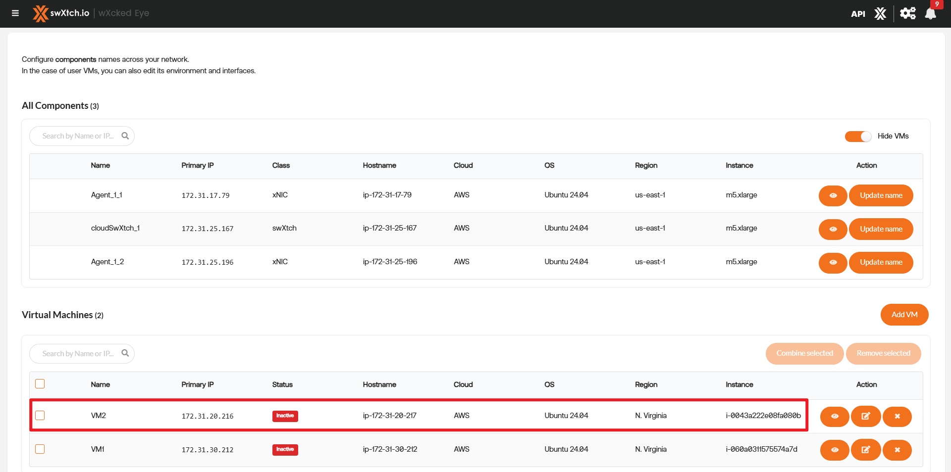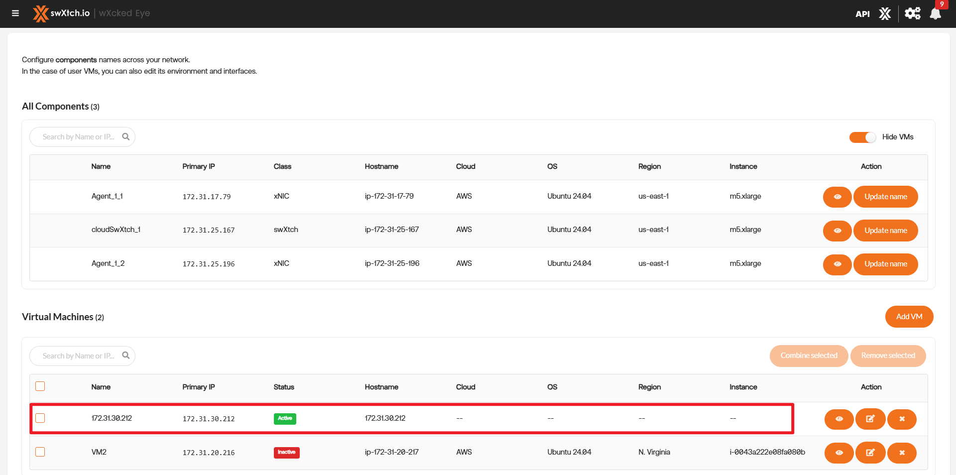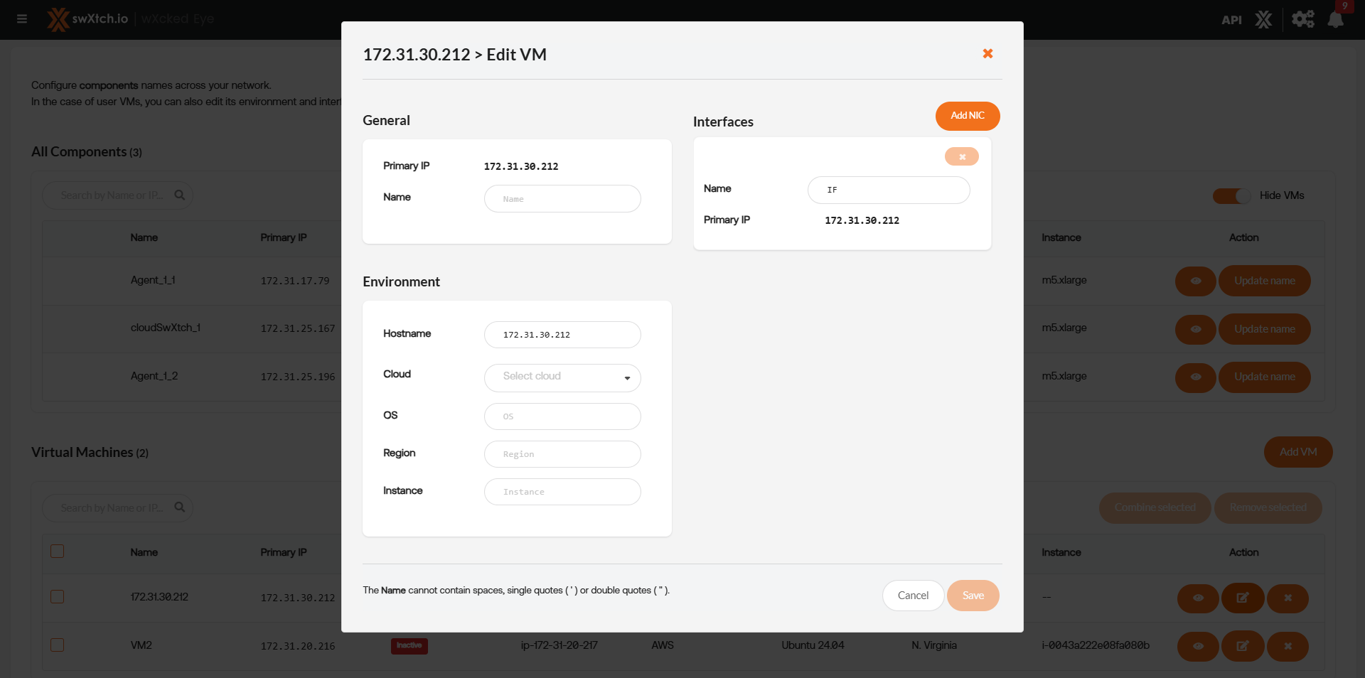 The Virtual Machines section is designated for VMs without an xNIC installed. Here, users can manually populate information for these non-xNIC VMs, such as the name, Primary IP, hostname, cloud provider, the operating system, the region, and the instance type.