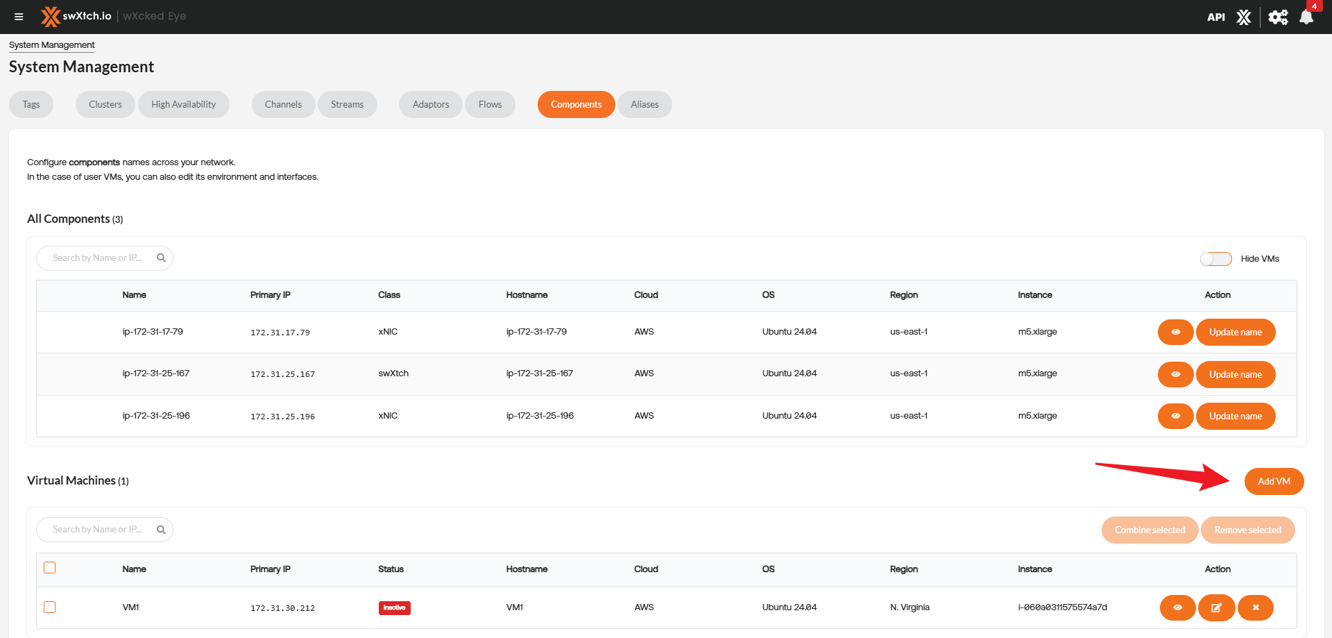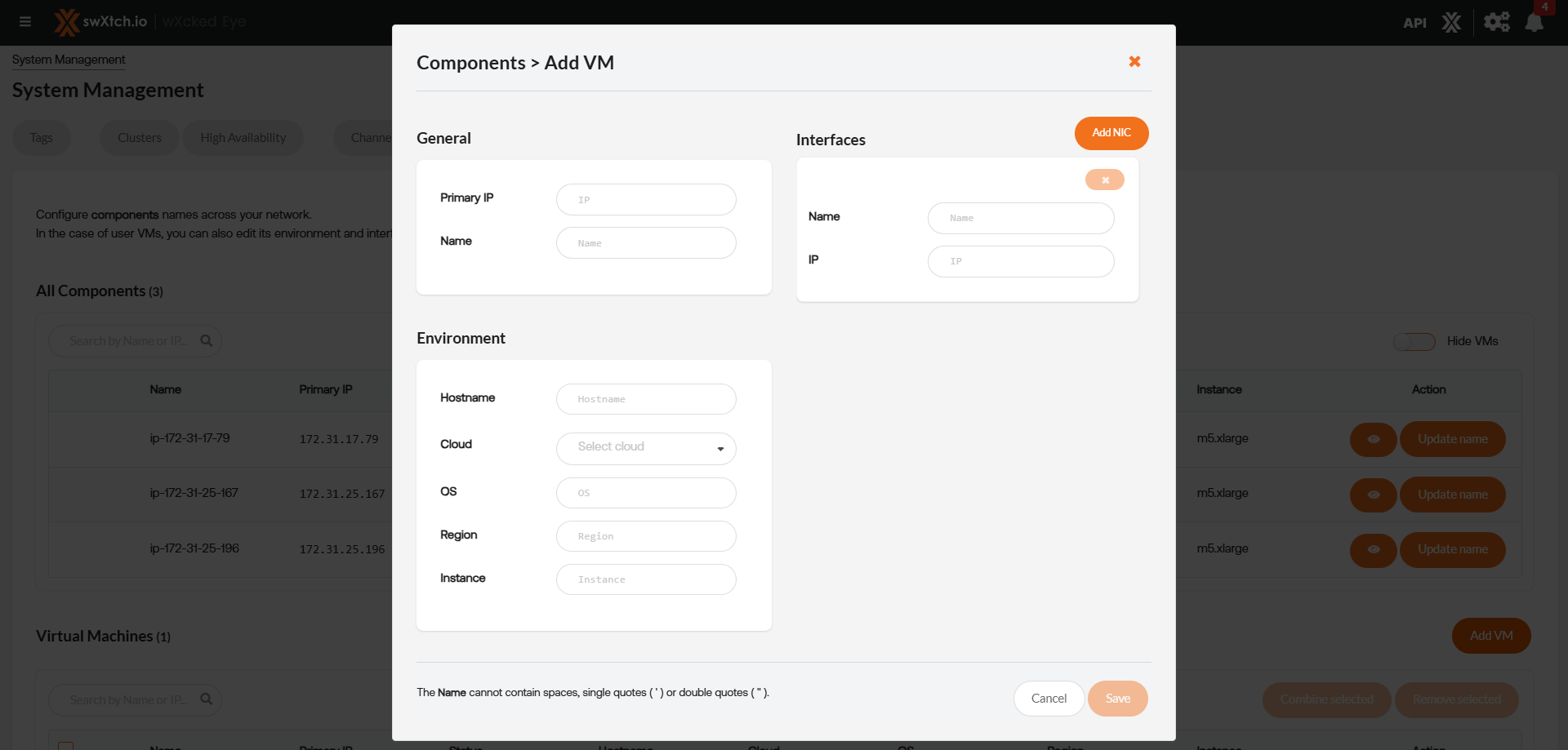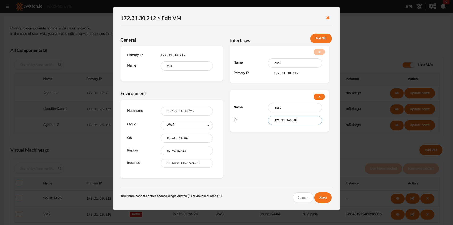 The Virtual Machines section is designated for VMs without an xNIC installed. Here, users can manually populate information for these non-xNIC VMs, such as the name, Primary IP, hostname, cloud provider, the operating system, the region, and the instance type.