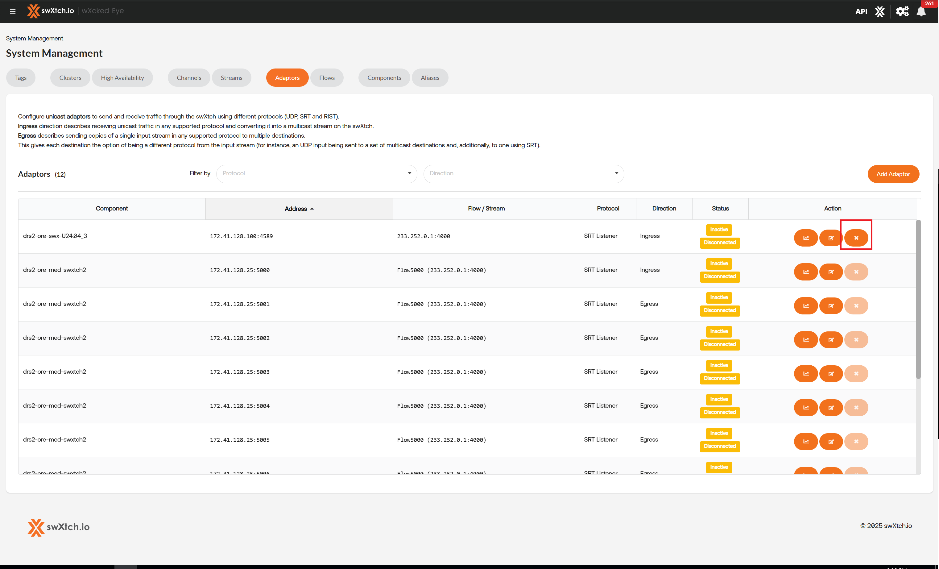 The Protocol Fanout feature enables cloudSwXtch and swXtchBridge components to replicate a single input stream and distribute it to multiple destinations simultaneously. Acting as a versatile protocol converter, it allows a stream arriving in one unicast format (such as SRT) to be "fanned out" to various clients in different formats—including UDP, SRT, RIST, or multicast—depending on the specific requirements of each destination. Note that many adaptors can be added at one time using Flows.