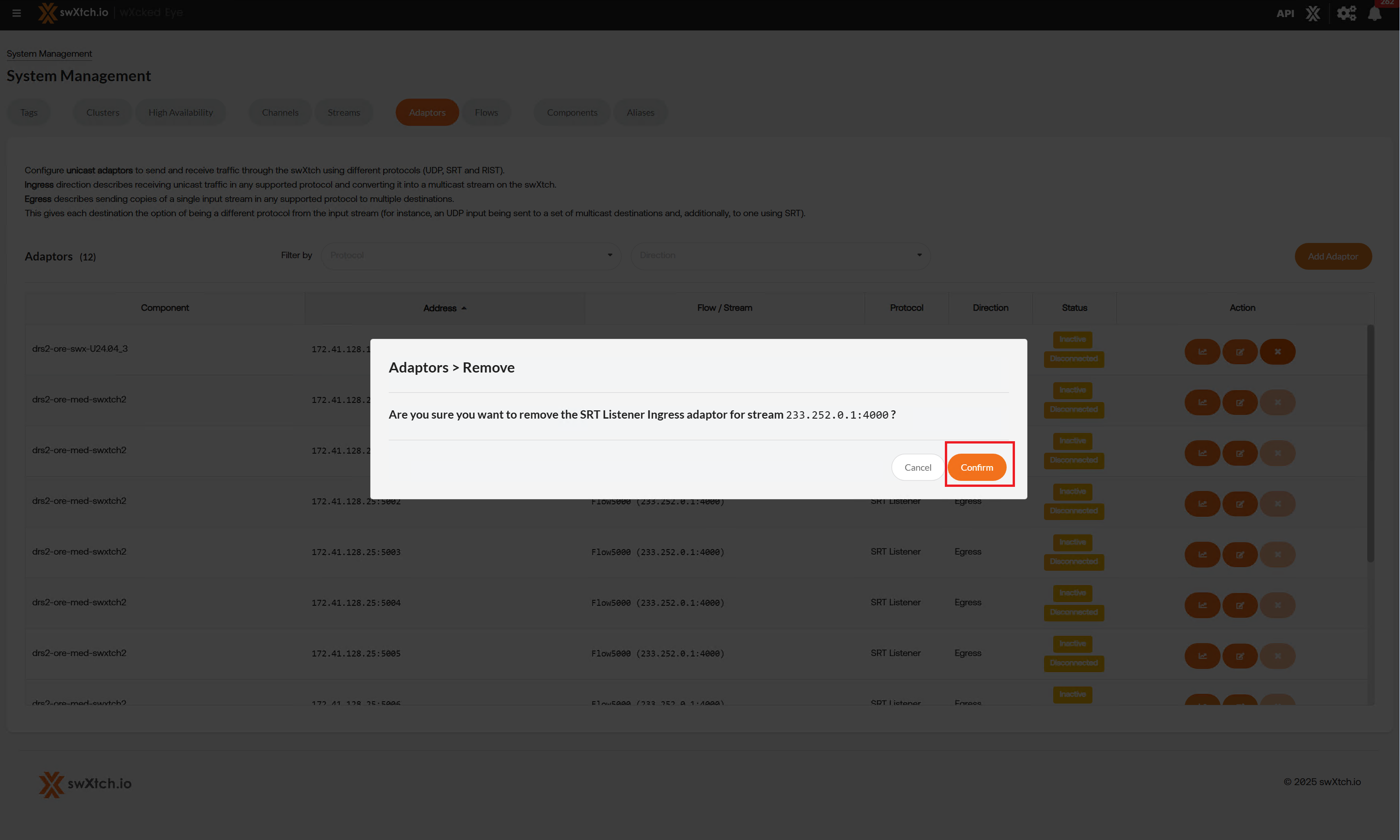 Note that some adaptors the Remove button is greyed out.  This is because they were added using flows.  To remove the ones added using flows see Editing a Flow to edit destinations (add or remove them) or Deleting a Flow to delete all the adaptors added via a particular Flow.