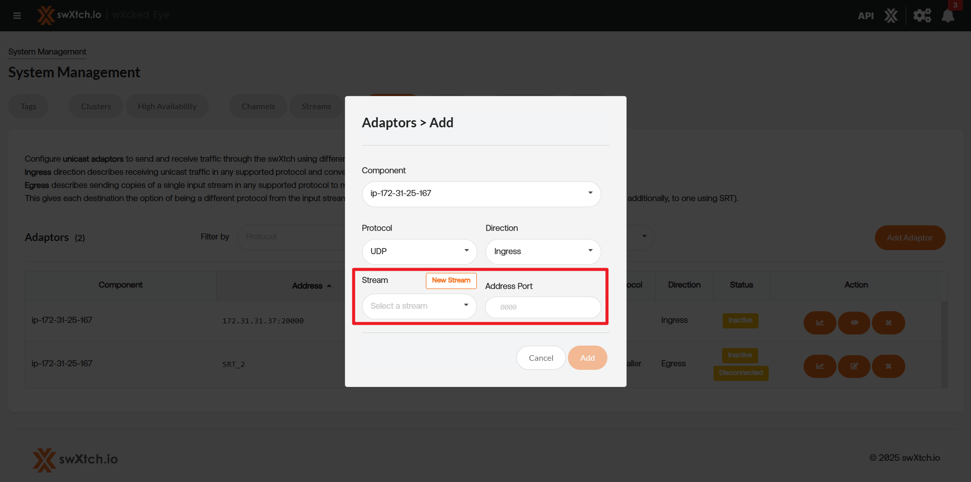1. Select one of the Streams created in the Streams tab from the dropdown, and designate a listener Address Port