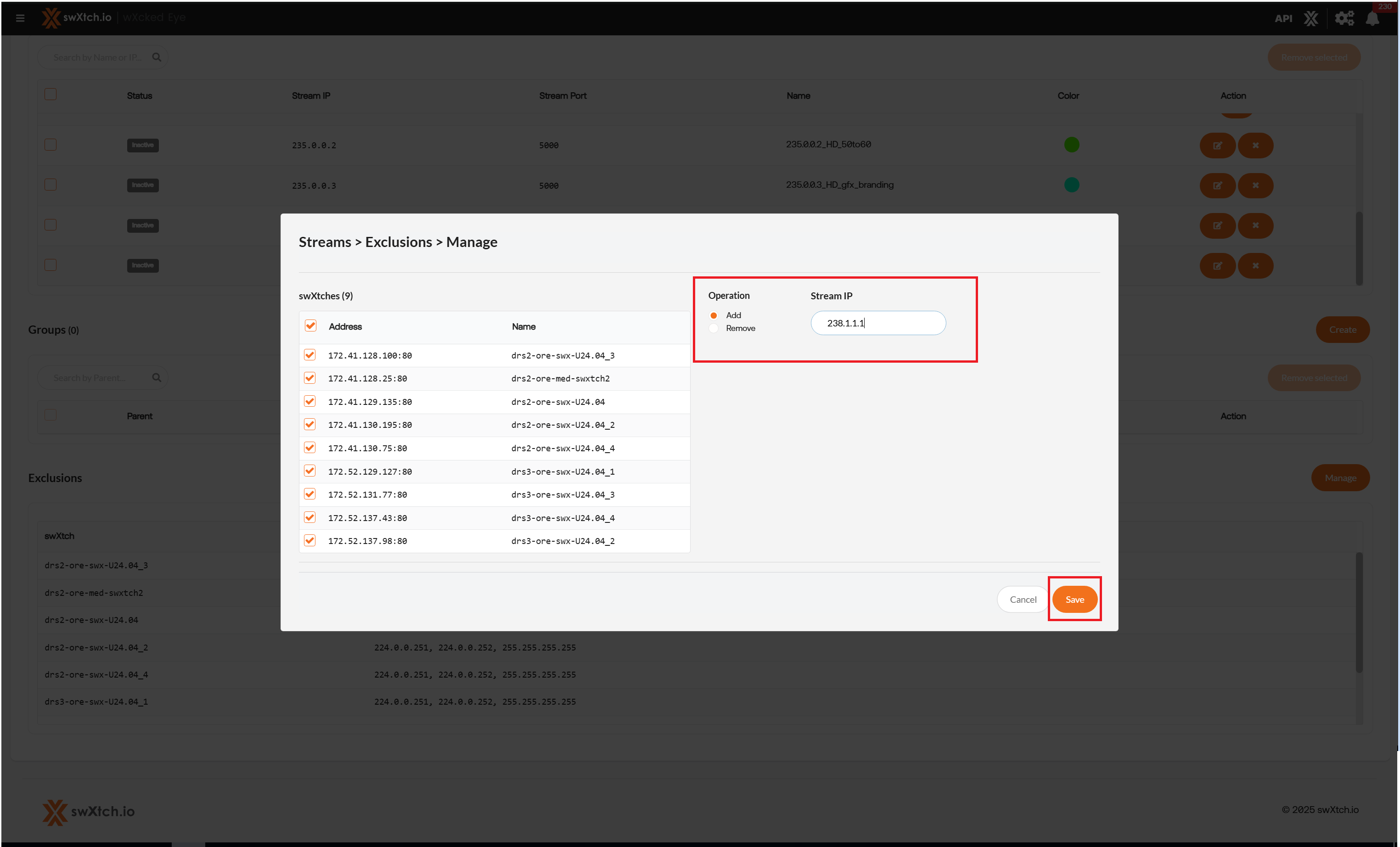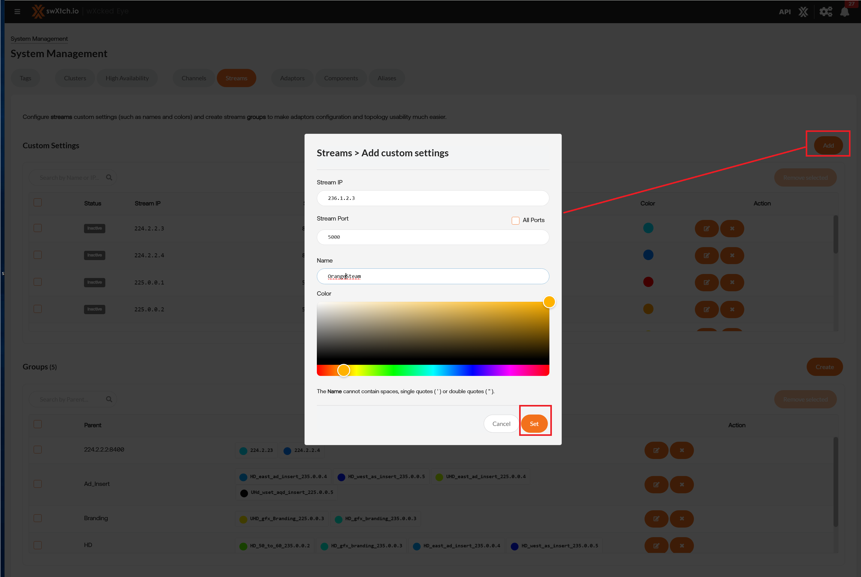 Add the Stream IP, Stream Port, Name and Color of the stream.