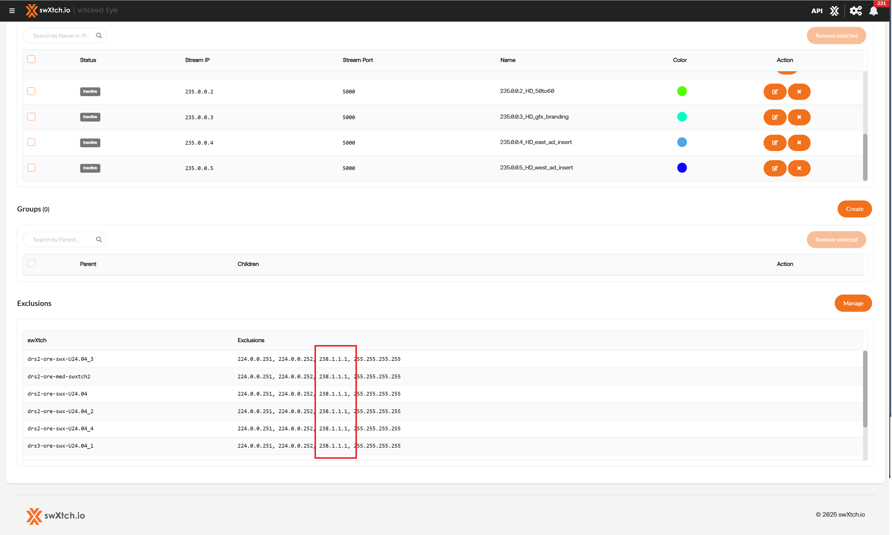 The streams tab displays all the streams that are running in the system and/or streams that have been configured by a user for a particular purpose. It also allows a user to group streams so that in the Topology Table the user can see a set of streams that belong to a particular group. Finally, this tab allows the user to add exclusions to stream so that certain streams will not display in the user interfaces either wXcked Eye or swx-top. This is is important as some streams are multicast streams, but they are messaging for example between Windows VM’s and are not necessarily streams that a user wants to view in the graph, table or swx-top.