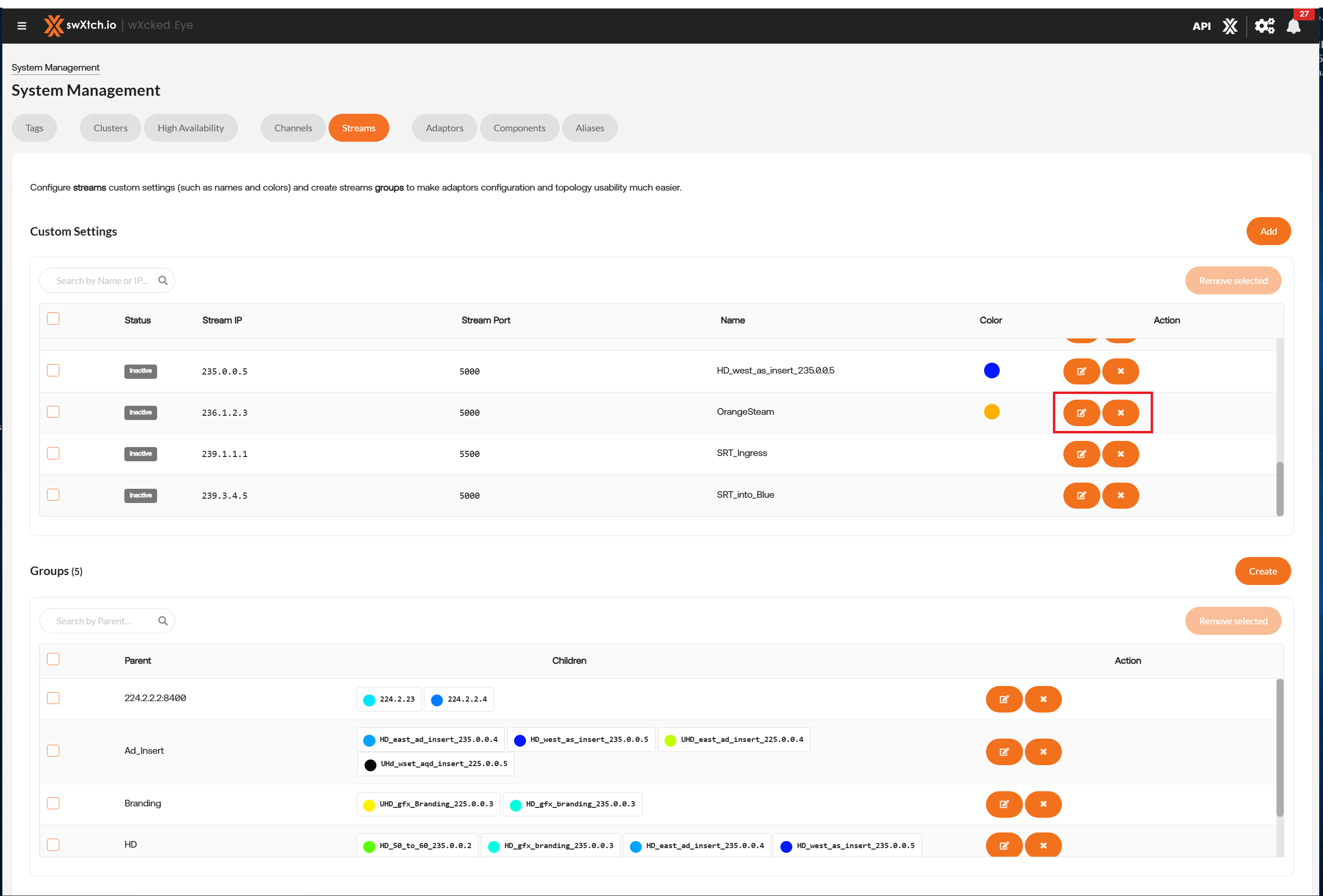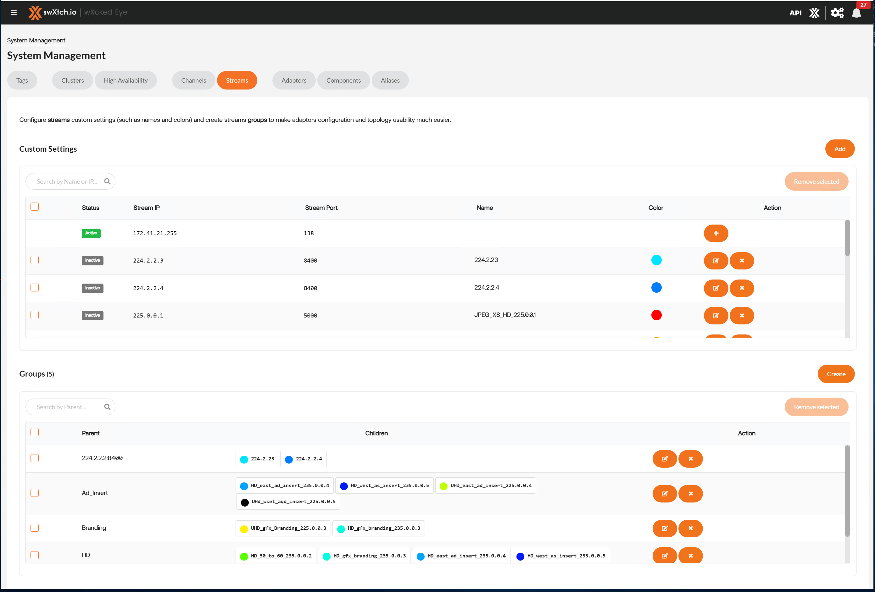 Users can name and define streams so that they can be easily reused when adding them to different groups or channels throughout wXcked Eye. Streams are dynamically added when a consumer does an IGMP join via a VM with an xNIC. In the streams tab, users can add, edit, and remove streams. Colors can be assigned to streams so that they are easily found in the Topology Graph.