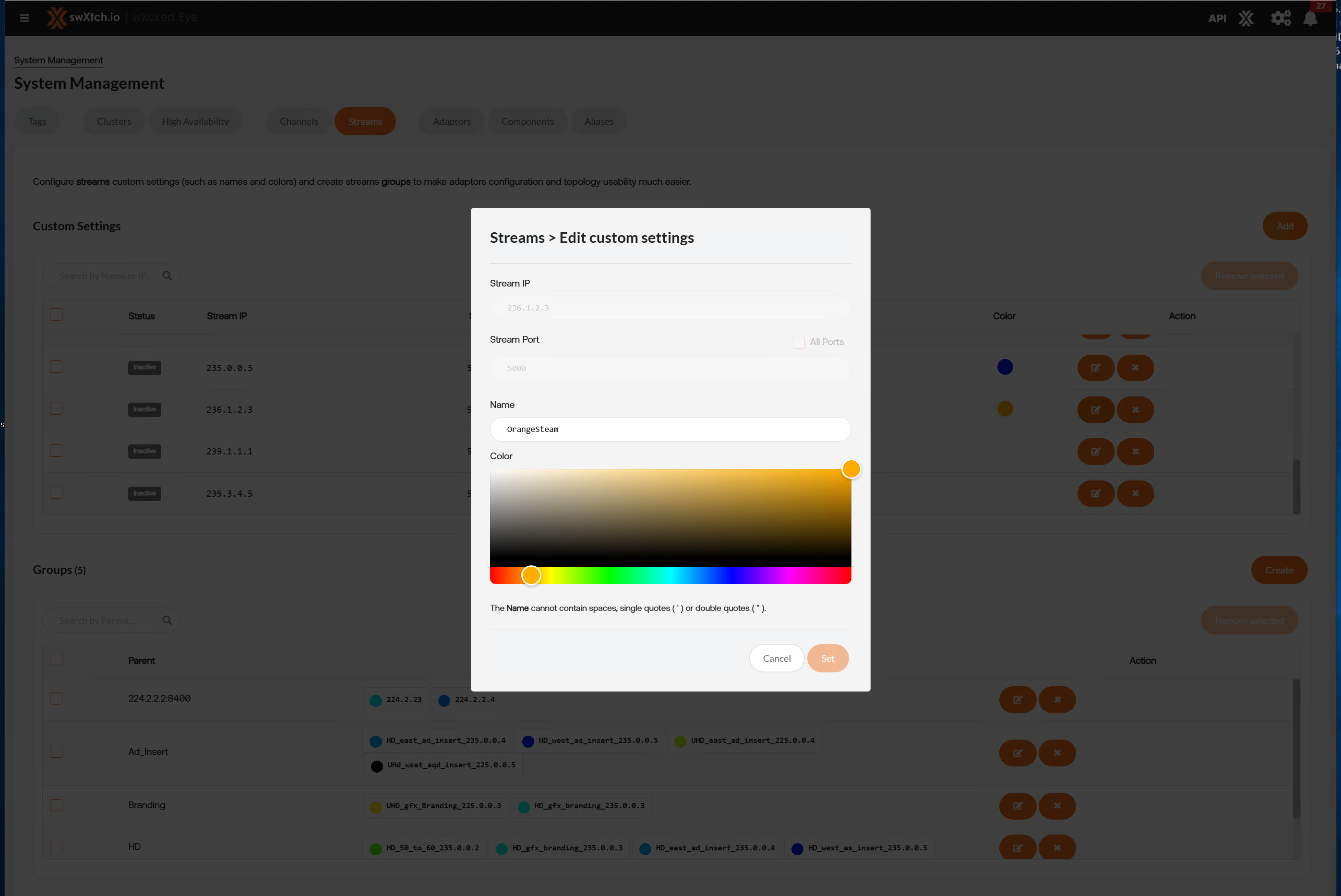 Editing the stream will open a new window where the stream’s name and color can be altered. Users cannot edit Stream IP or Stream Port.