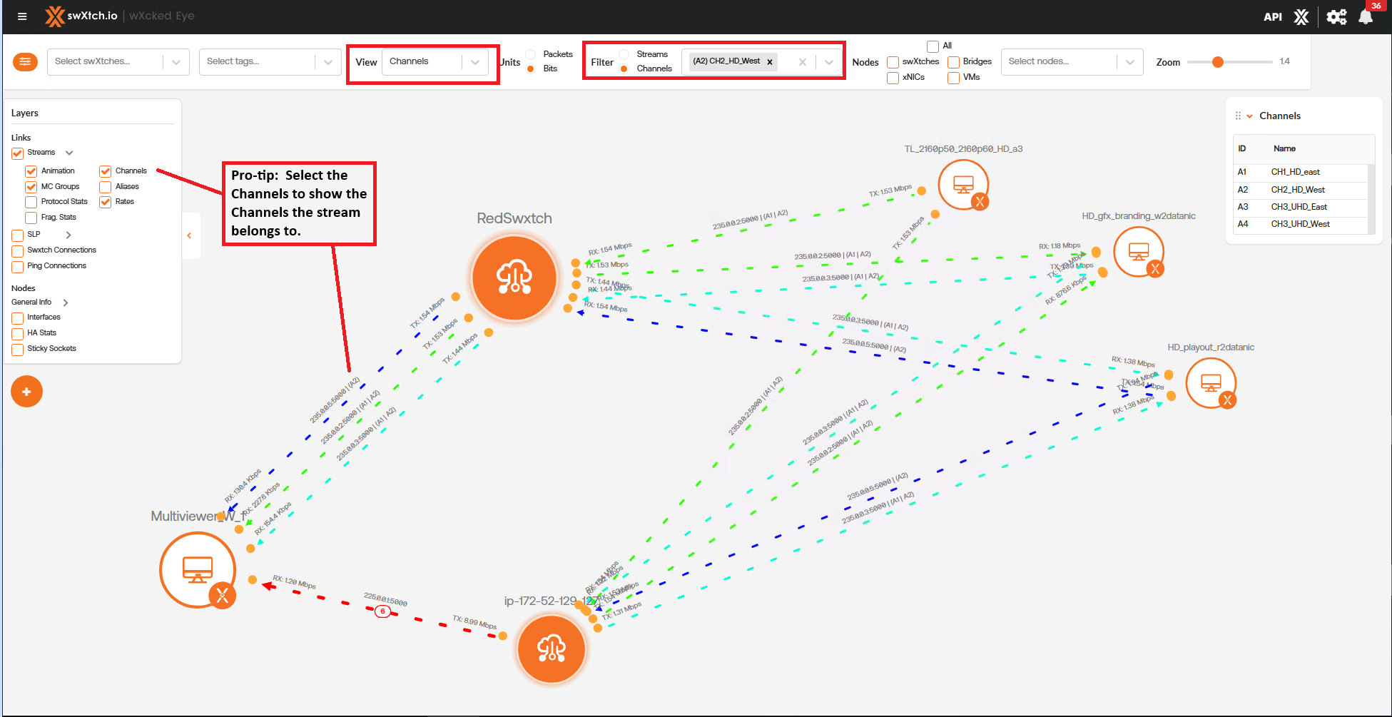 When the View is set to Channels, an additional Filter By Channel option will activate, allowing users to highlight streams related to a specific channel. In the example below, the user filtered on the channel "(A2) CH2_HD_West." All related streams are highlighted in the graph.