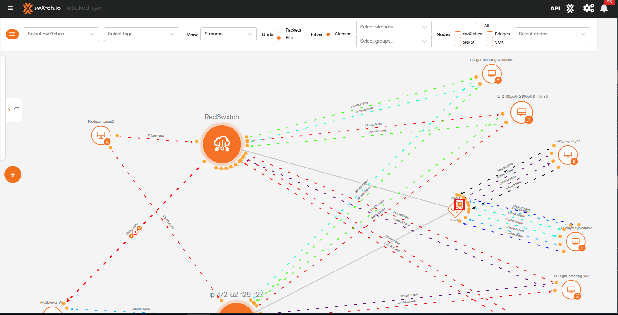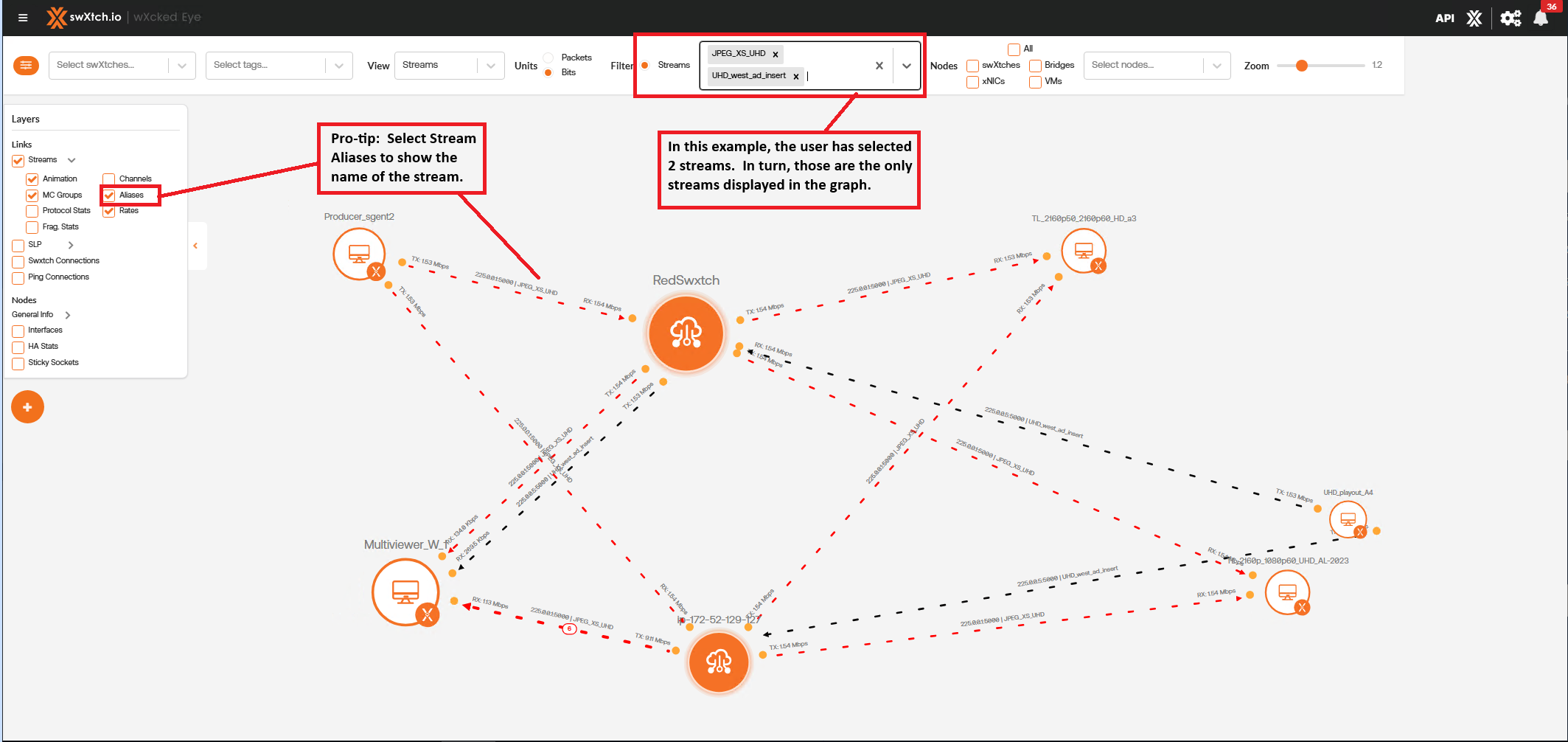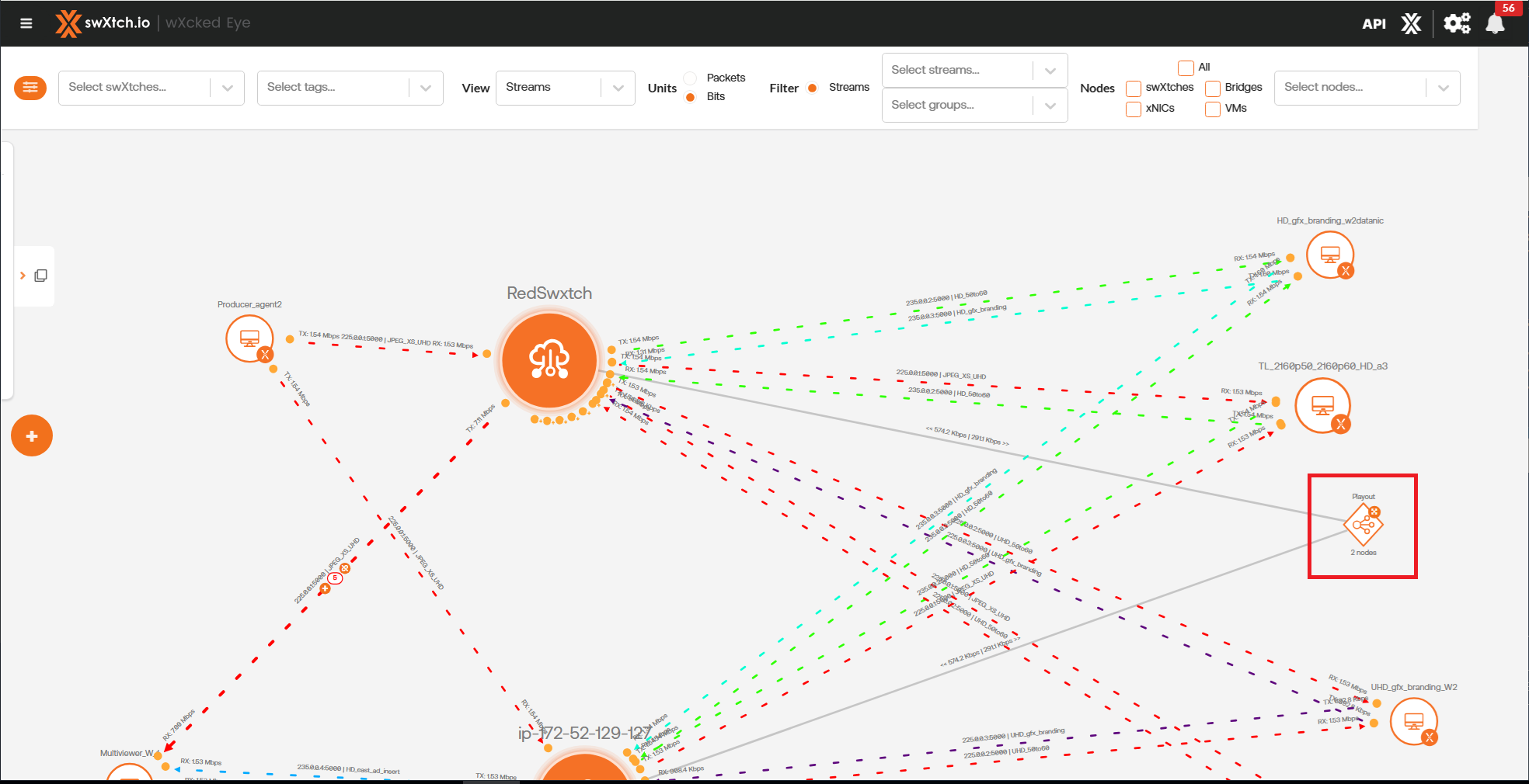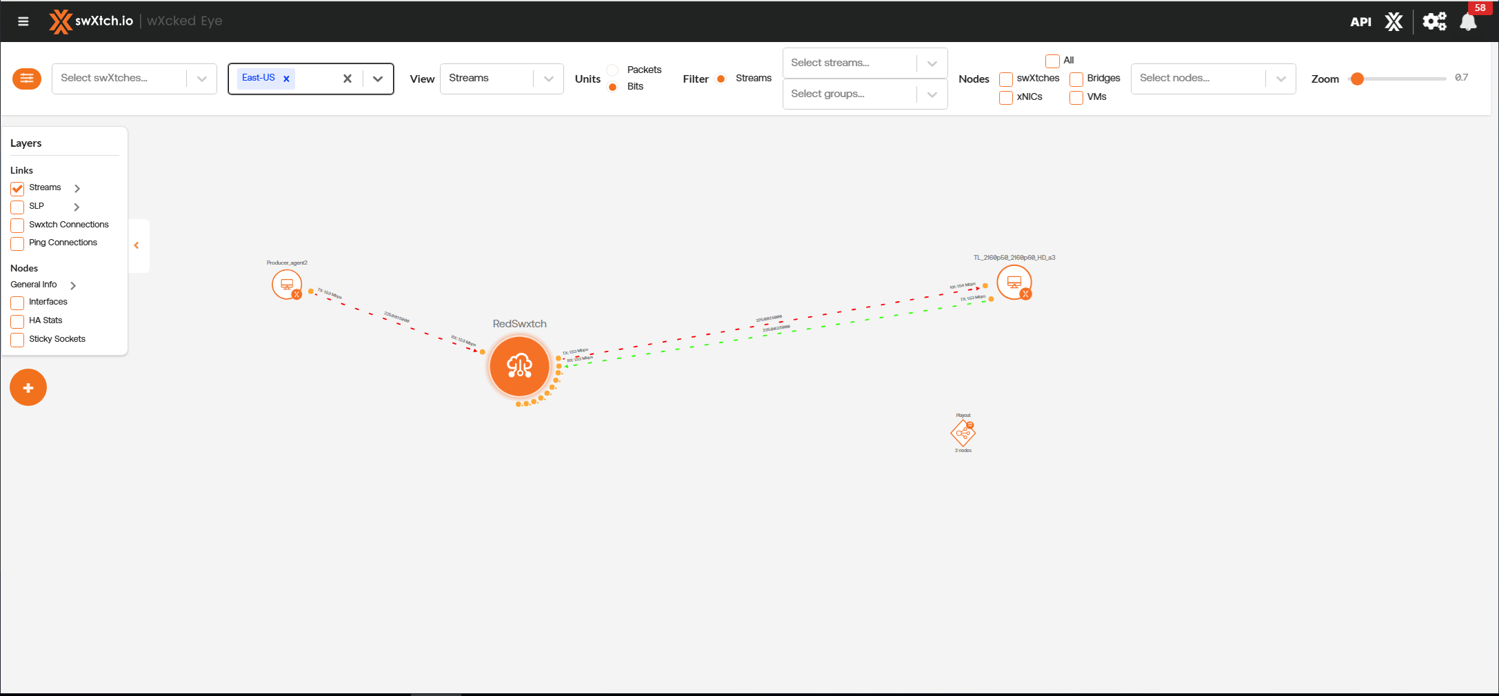 Below is the result of selecting one cloudSwXtch. Note that 2 of the cloudSwXtches in this case are in High Availability mode; therefore, two cloudSwXtches show, but one is no longer showing as a cloudSwXtch as it is not the one to be viewed, but is still associated with the streams that the selected cloudSwXtch contains.