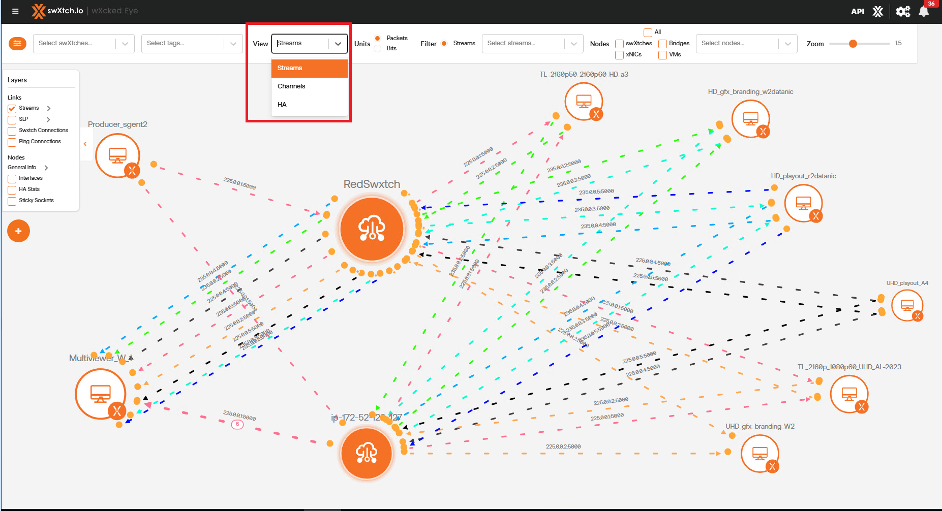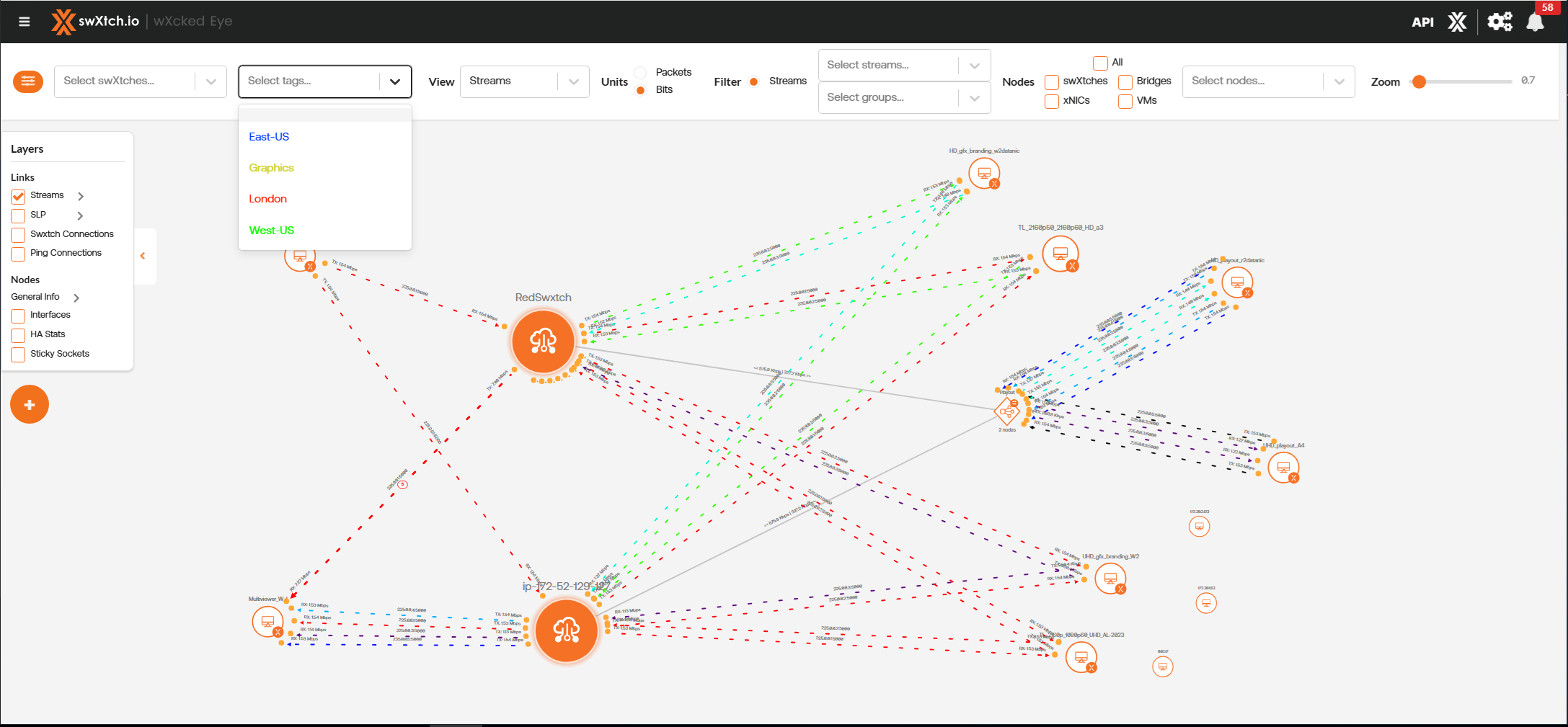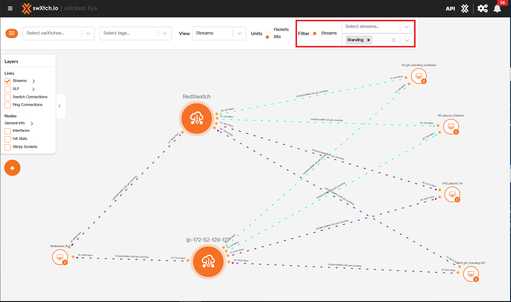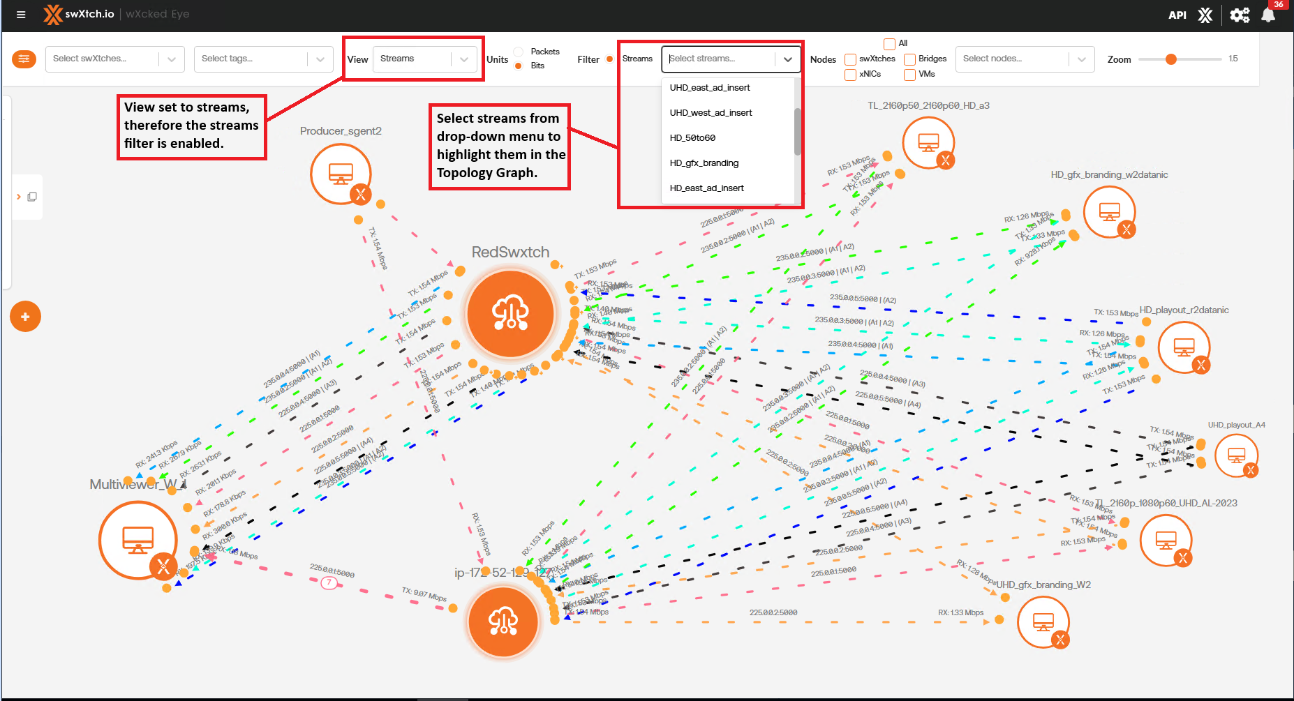 In this article, users will learn more about the functionality of the View By/Filter Bar in the Topology Graph. The data that is shown can be filtered by swXtches and Tags and the view can be adjusted by Streams, Channels or HA cluster.