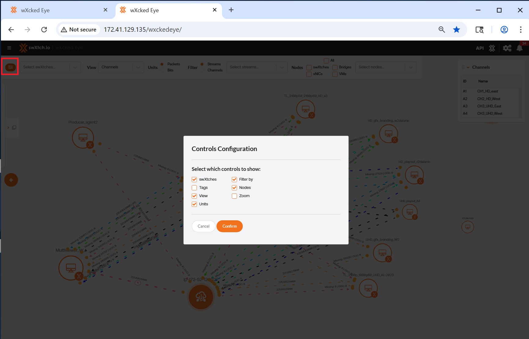 In addition to selecting streams individually, users can also select a group of streams all at once. Groups are created in the wXcked Eye System Management Streams page. When selecting a group, users will see the streams assigned to that group highlighted in the topology graph. In this example, the user created a group called Branding for all their channels where the graphics branding are being inserted. By selecting the group, all the streams assigned to it are highlighted below by their stream color.