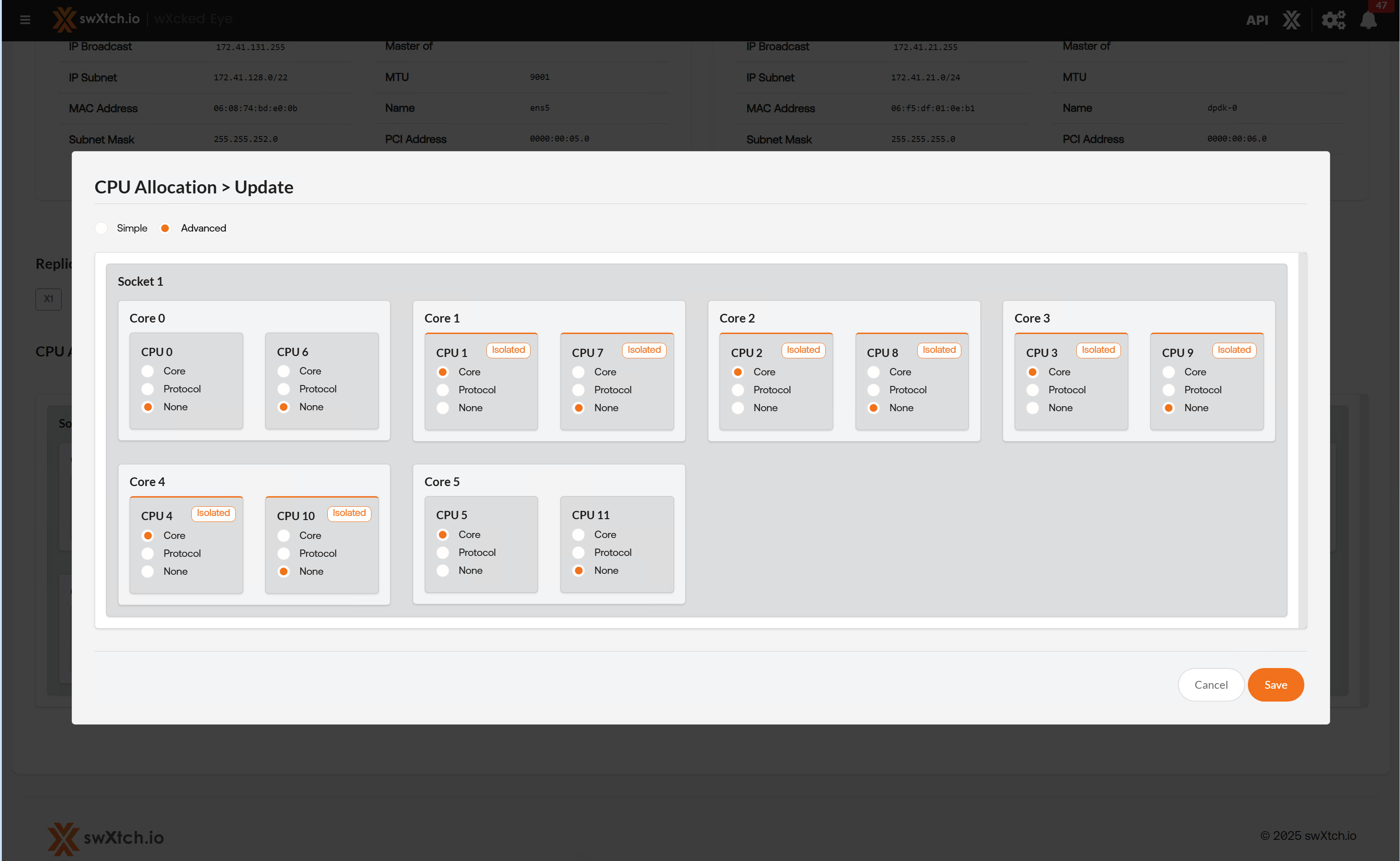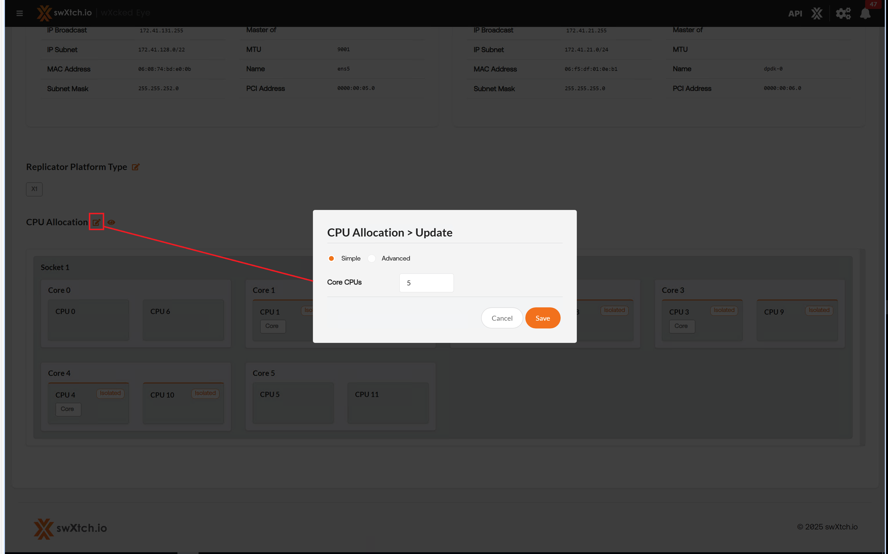 CPU allocation can be changed in swXtch Management by selecting the CPU Allocation edit button. Contact support before changing this setting by emailing support@swxtch.io.