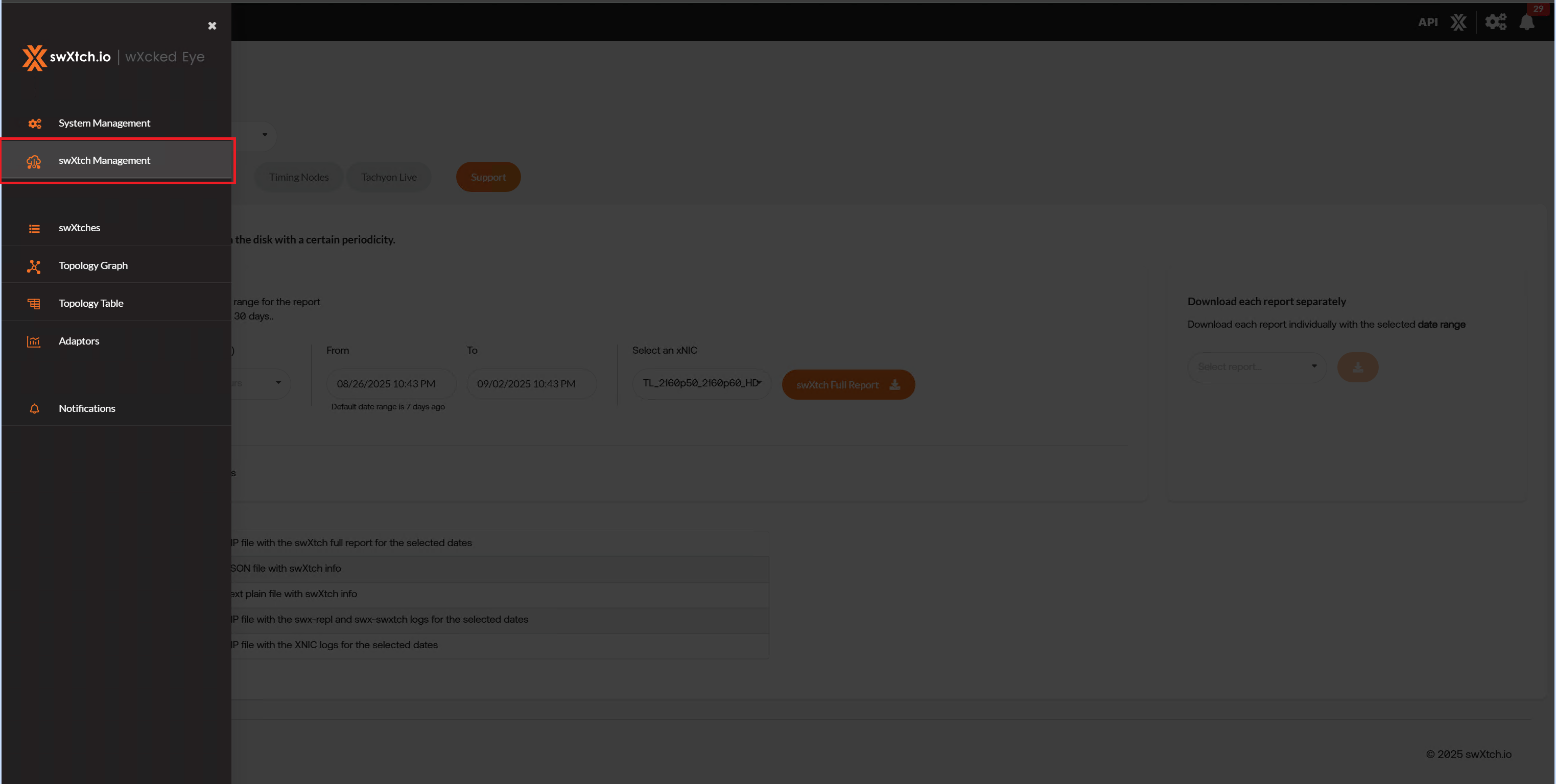 The swXtch Management page is organized into six tabs with varying functionalities:
