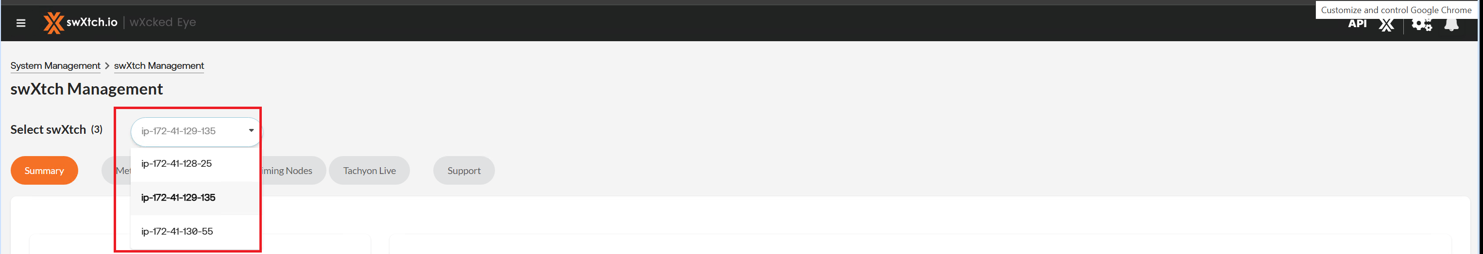 The tabs in this section are dependent on the cloudSwXtch selected. The drop-down selection will display each cloudSwXtch that is configured in the system. CloudSwXtches are added to this display via adding a Cluster in System Management or via the swXtches page. In this example, there are 3 cloudSwXtches. To toggle between cloudSwXtches, use the drop-down selection.