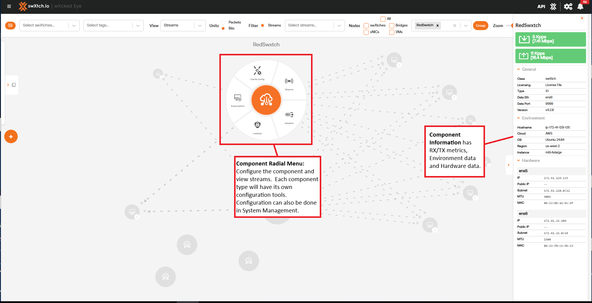 In addition to these four main areas, selecting a component node in the topology graph will open its Component Information Panel. Here, users will find metrics specific to that component and additional specific information, such as Environmental and Hardware data. Selecting a component with a right click opens the Radial Menu for configuration options. Depending on the component class (cloudSwXtch, bridge, or xNIC), this could include adding adaptors for protocol fanout via the cloudSwXtch component node, configuring HA at the xNIC level, and toggling deduplication on or off for the endpoints. Note that most of this configuration can also be accomplished via System Management.