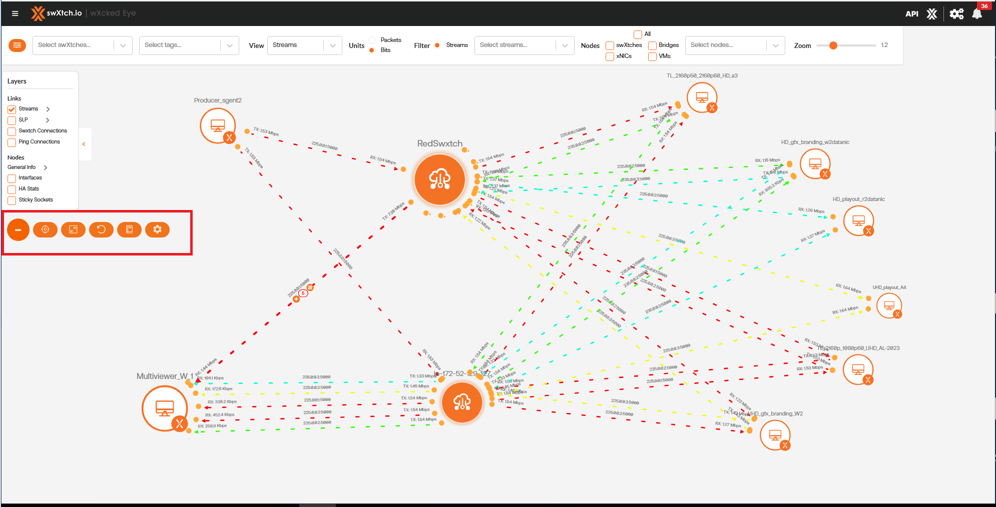 The Topology Graph can be organized into four points of interest. To start, the main topology graph, at the center, displays traffic traveling to and from one or more the cloudSwXtch(s). Then, there are two configuration panels: The View By/Filter Bar and the Laters Toolbox. Both are collapsible. Finally, on the left of the page, there are some additional tools, such as Center Graph, Resize Nodes, Remove Groups Config, Glossary, and Settings.