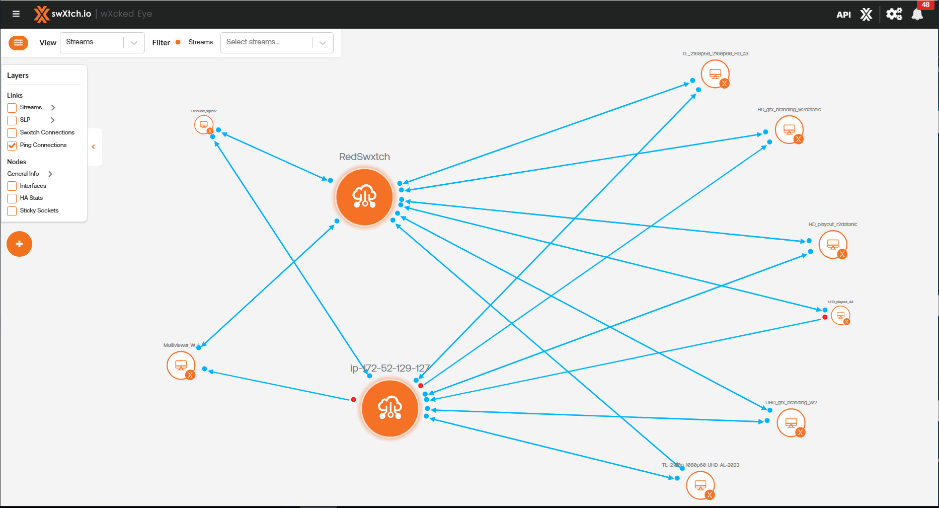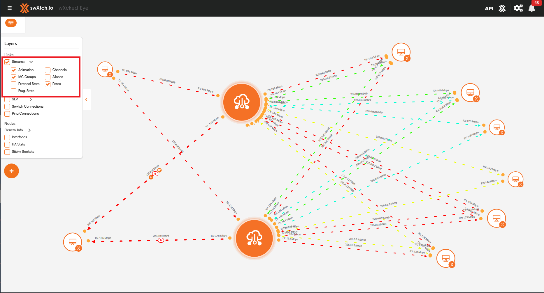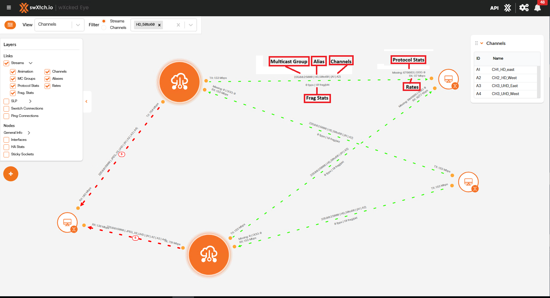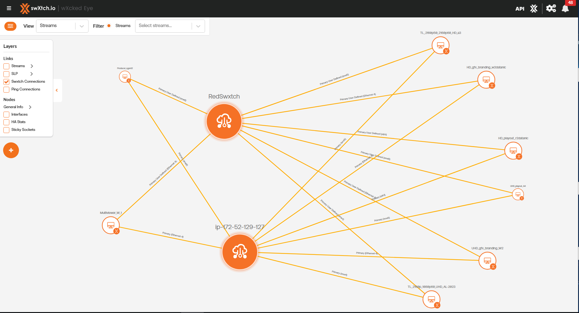 • Aliases: This will display the stream names at the center of the link.